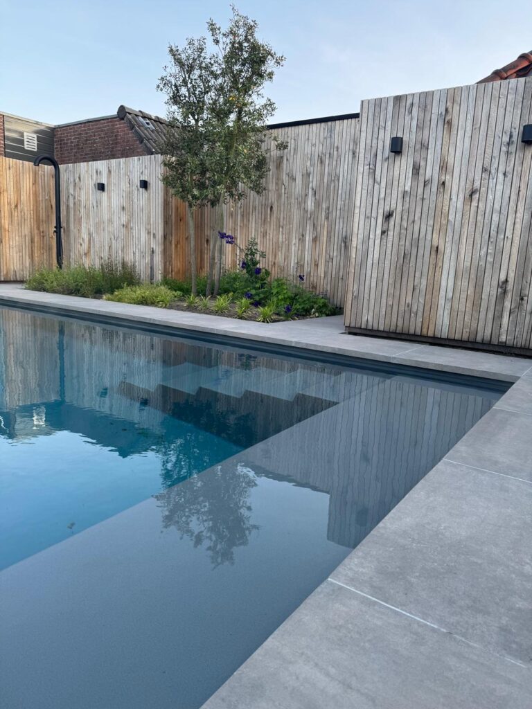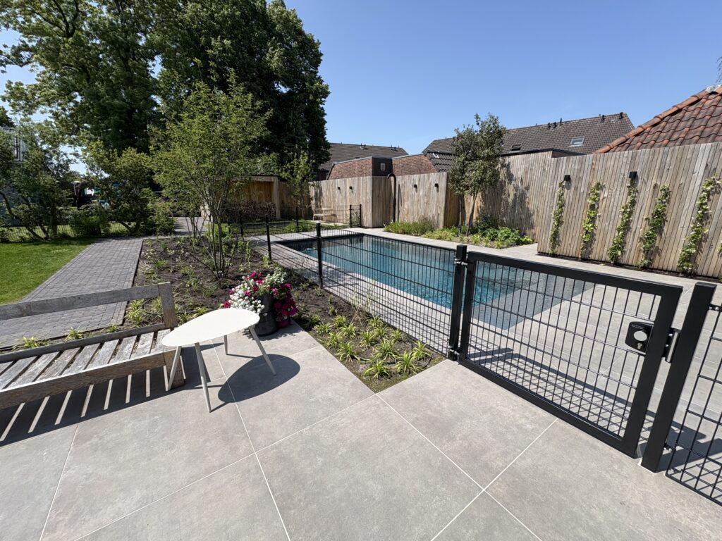 Samenhang in bestrating en groen De basis van de tuin wordt gevormd door een strak terras van grote, donkergrijze keramische tegels, gecombineerd met een pad van antracietkleurige klinkers. Deze combinatie zorgt voor een eigentijdse look en een duidelijke zonering. Centraal in de tuin ligt een perfect aangelegd gazon van verse graszoden, dat direct zorgt voor een frisse, groene rustplek.