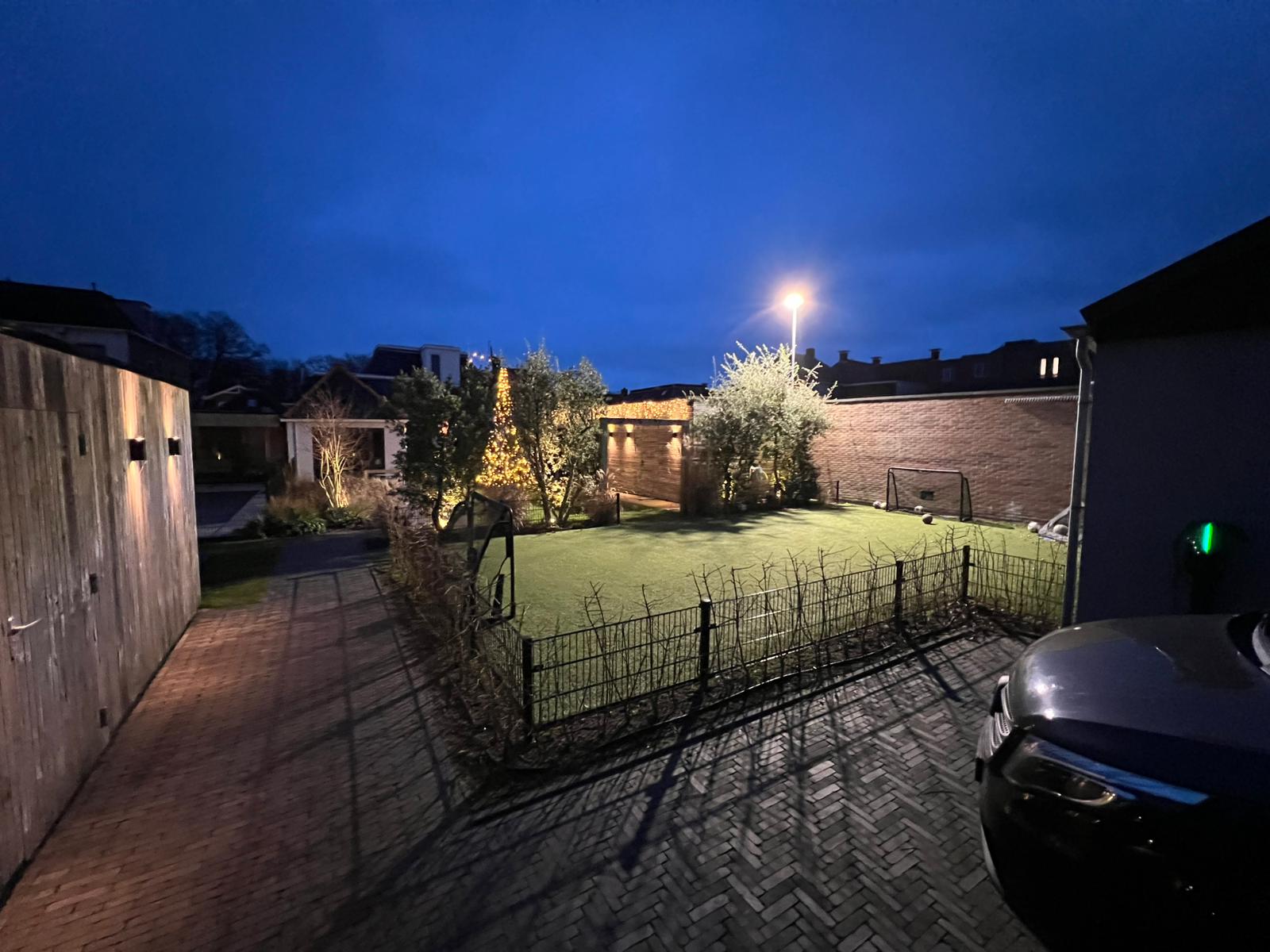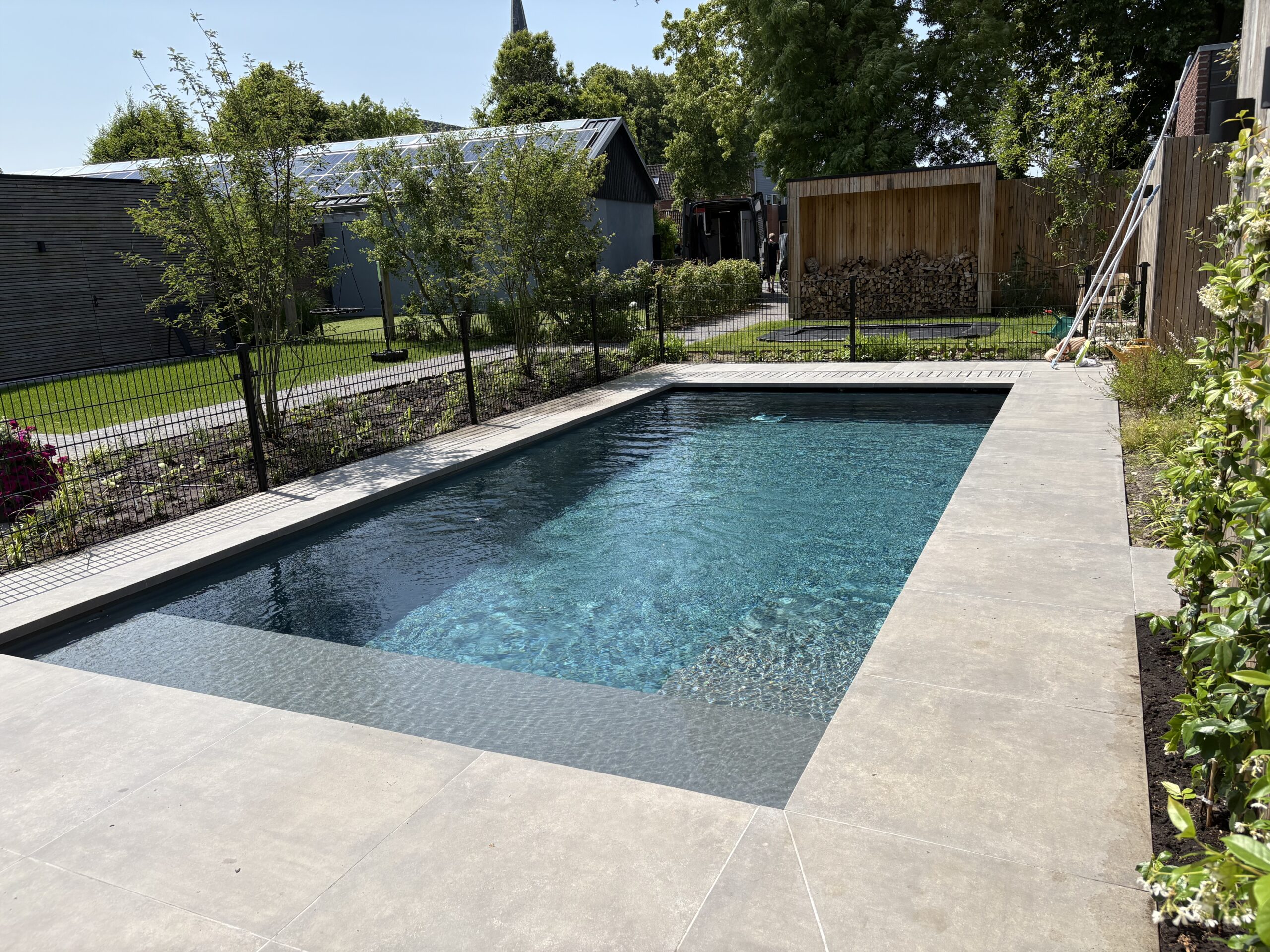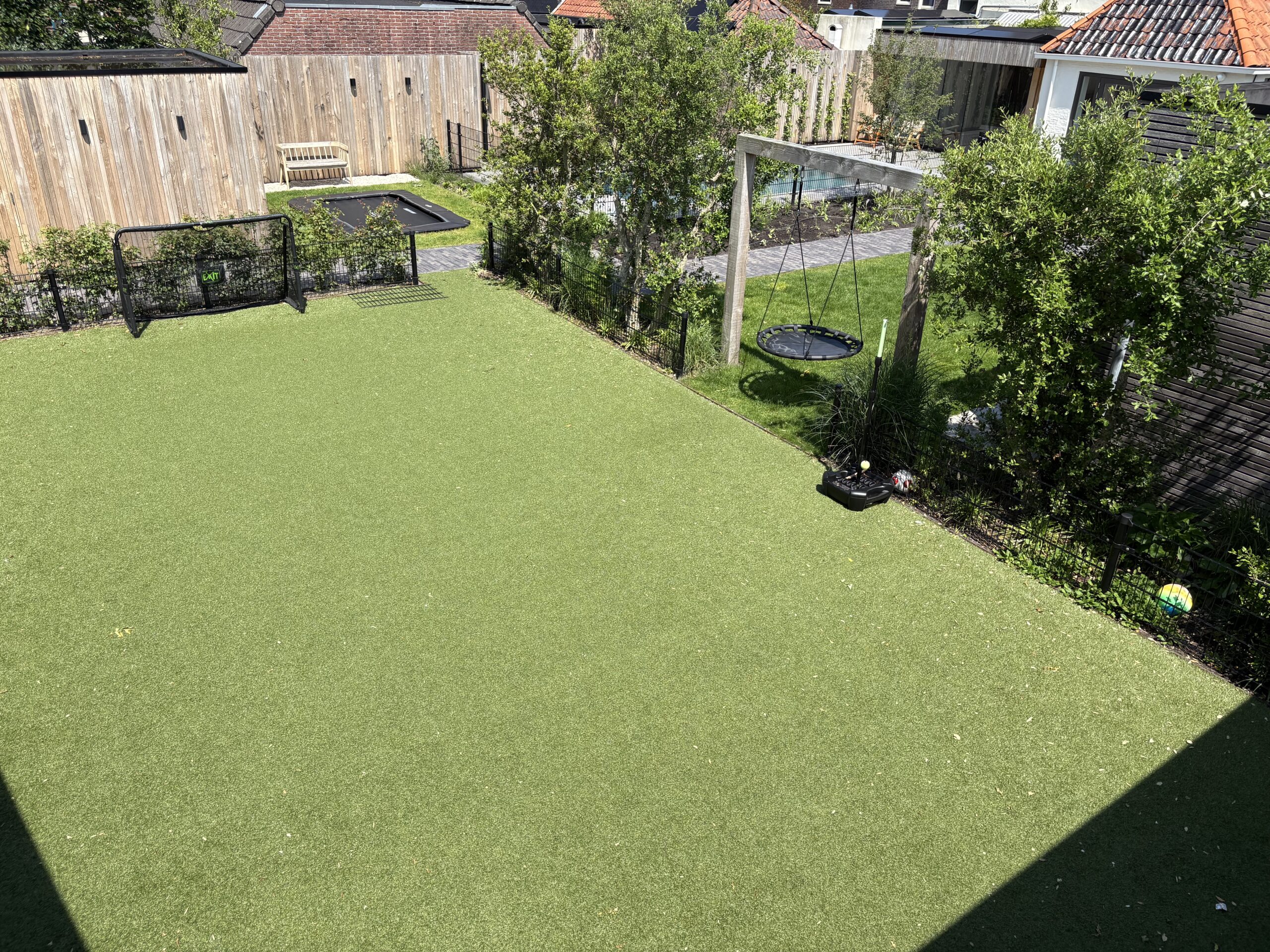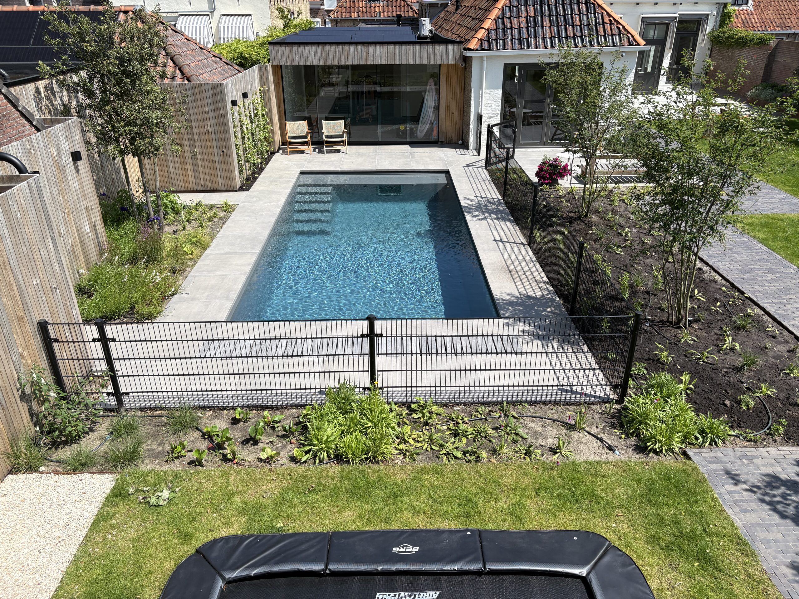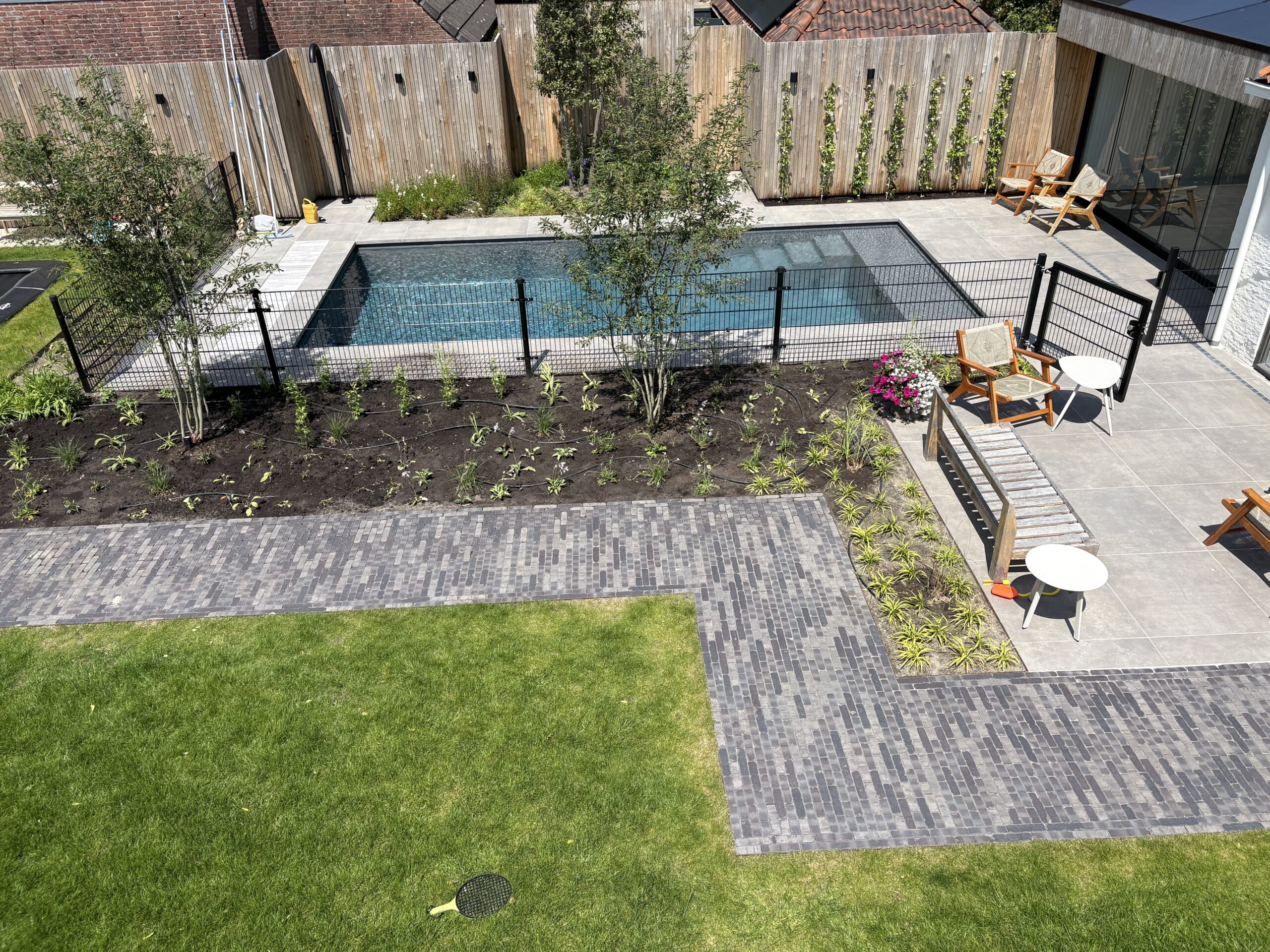 Samenhang in bestrating en groen De basis van de tuin wordt gevormd door een strak terras van grote, donkergrijze keramische tegels, gecombineerd met een pad van antracietkleurige klinkers. Deze combinatie zorgt voor een eigentijdse look en een duidelijke zonering. Centraal in de tuin ligt een perfect aangelegd gazon van verse graszoden, dat direct zorgt voor een frisse, groene rustplek.