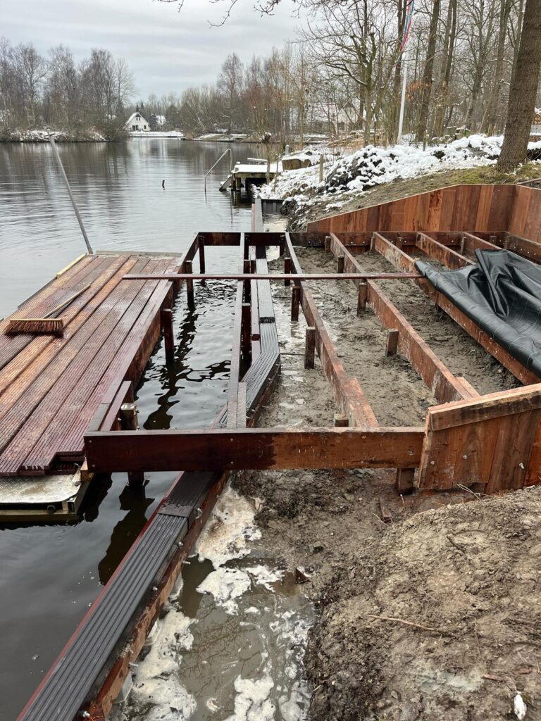 Solide basis aan de waterkant Het project begon met het aanbrengen van een duurzame walbeschoeiing. Deze vormt de noodzakelijke bescherming tegen oeverafslag en vormt tevens de stabiele basis voor de bovenliggende constructie. Zelfs onder winterse omstandigheden hebben we de robuuste onderbouw van de steiger exact op maat geplaatst, zodat een jarenlange levensduur gegarandeerd is.