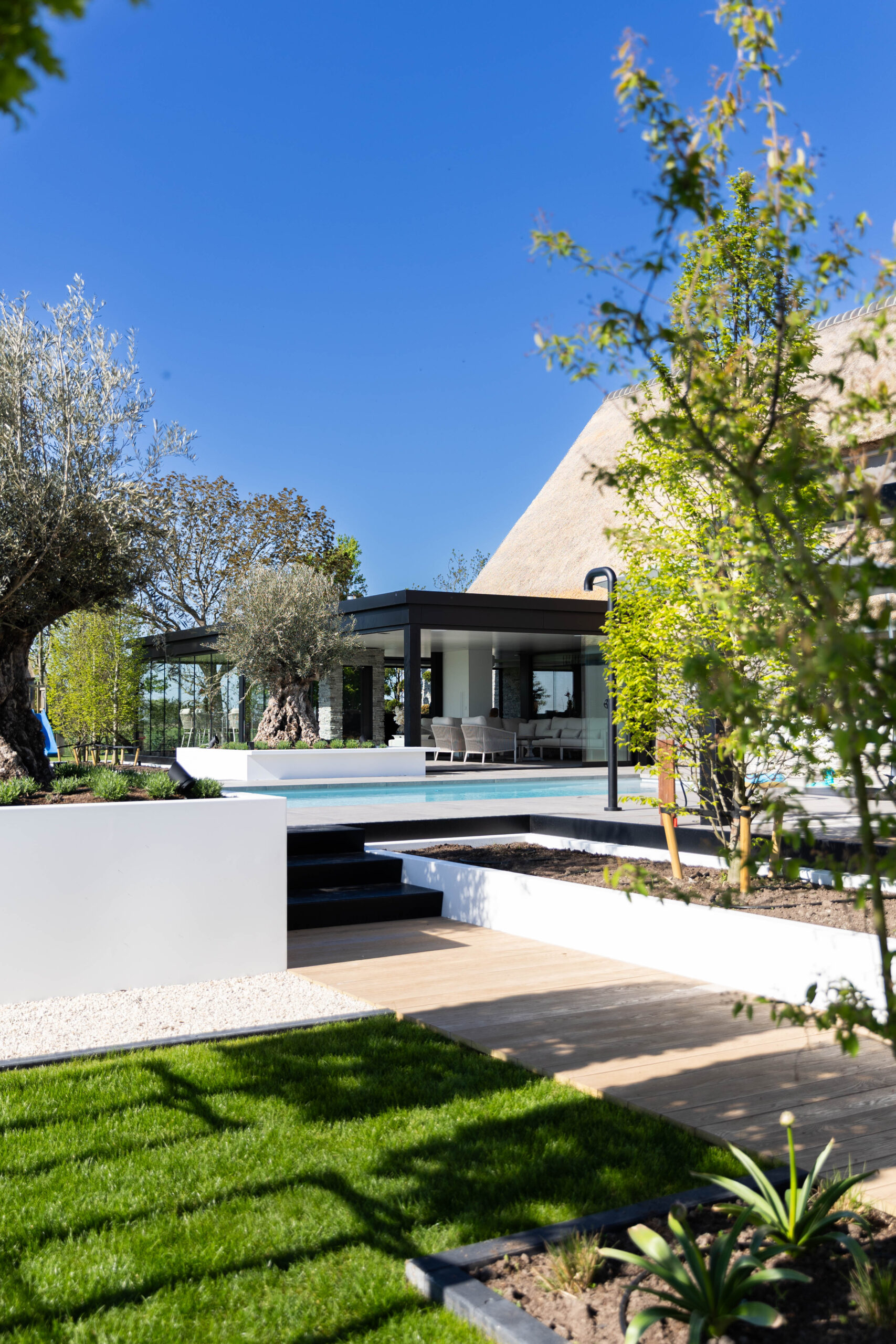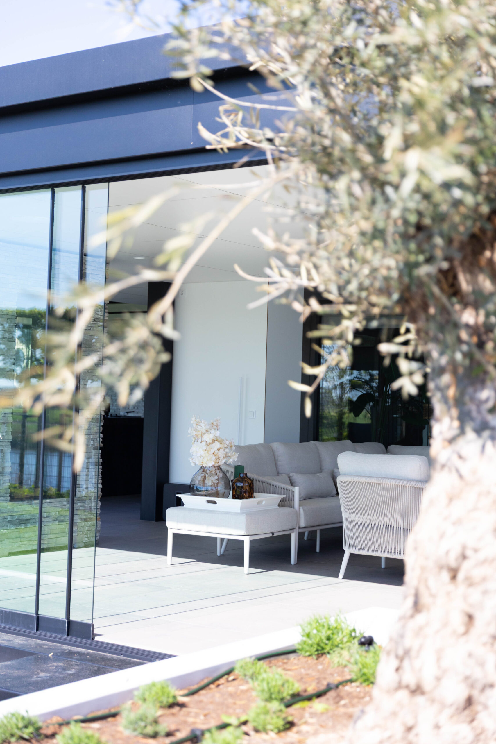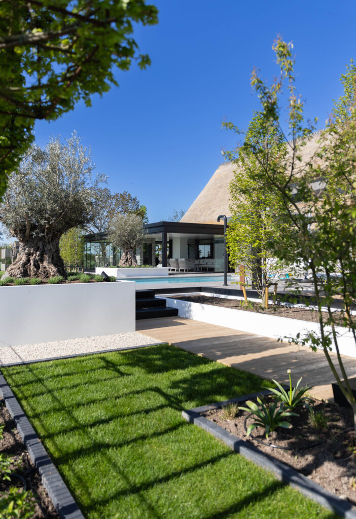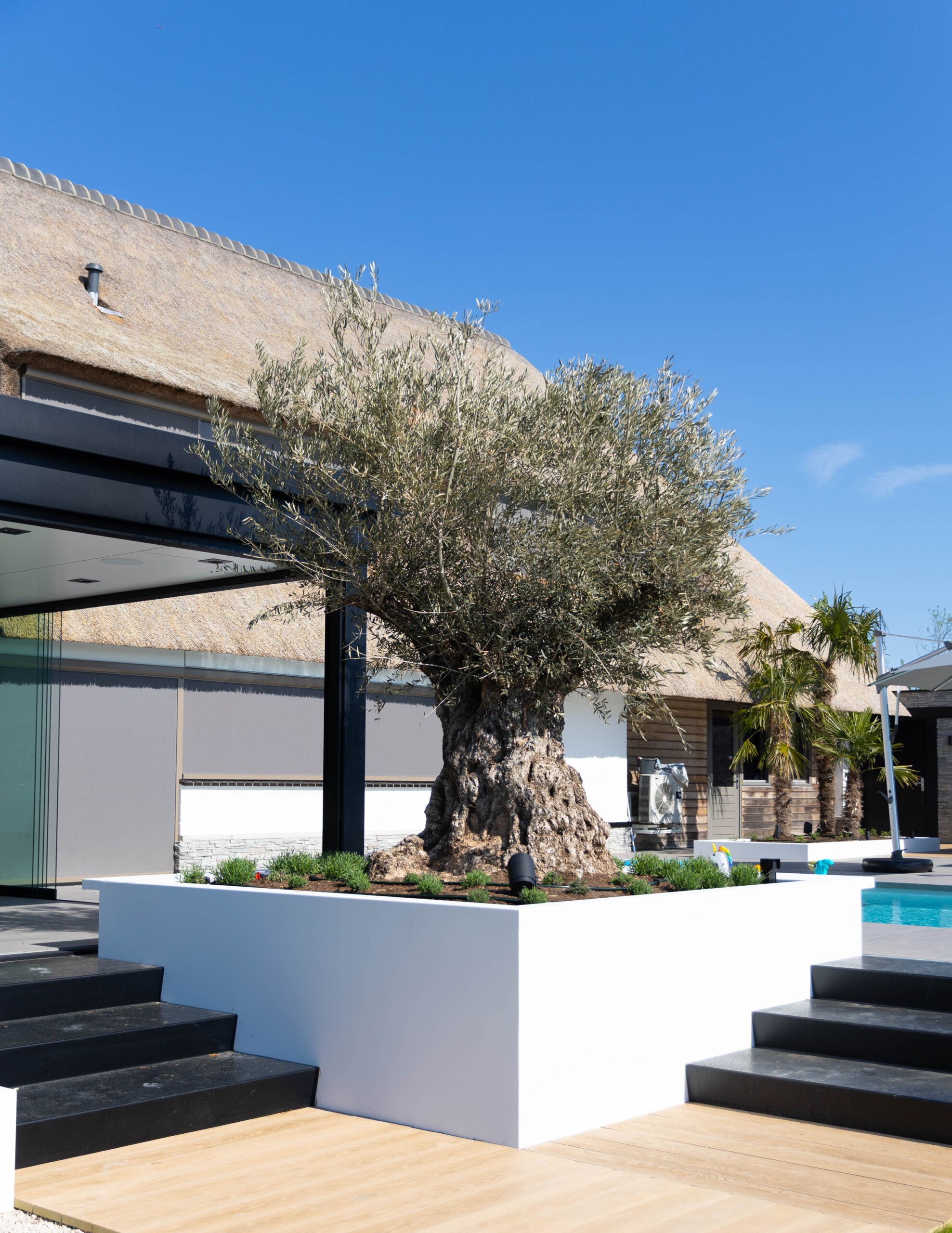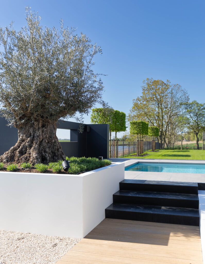 • Karakteristieke olijfbomen: De eeuwenoude olijfbomen stelen de show. Door ze in verhoogde, strak gestucte witte plantenbakken te plaatsen, komen ze prachtig tot hun recht en is de afwatering perfect geregeld.