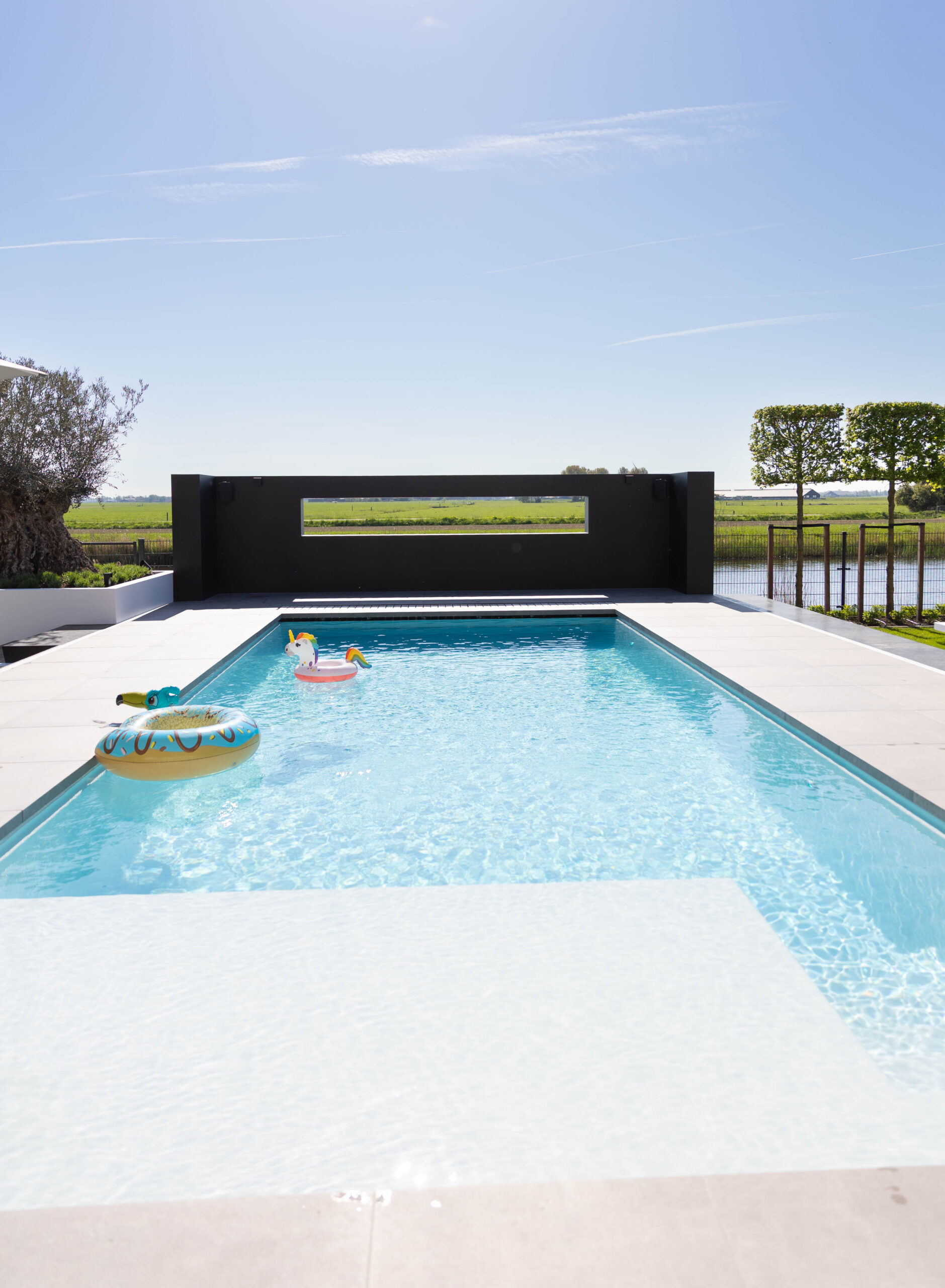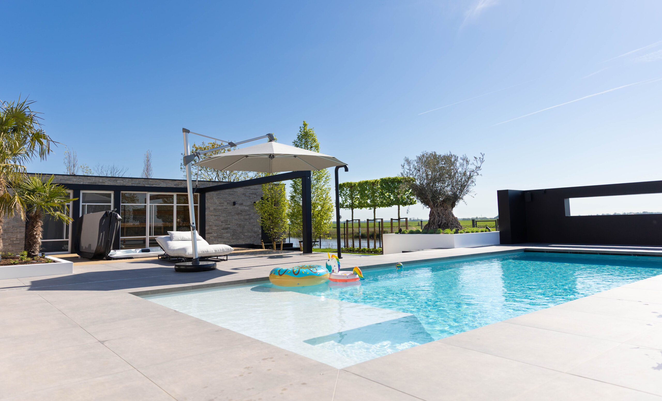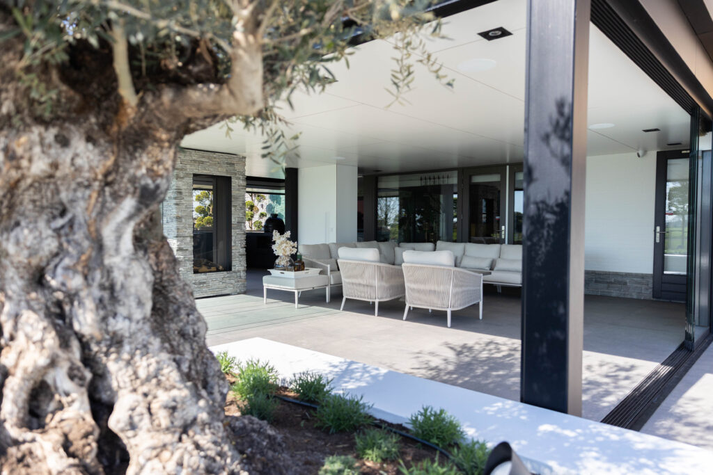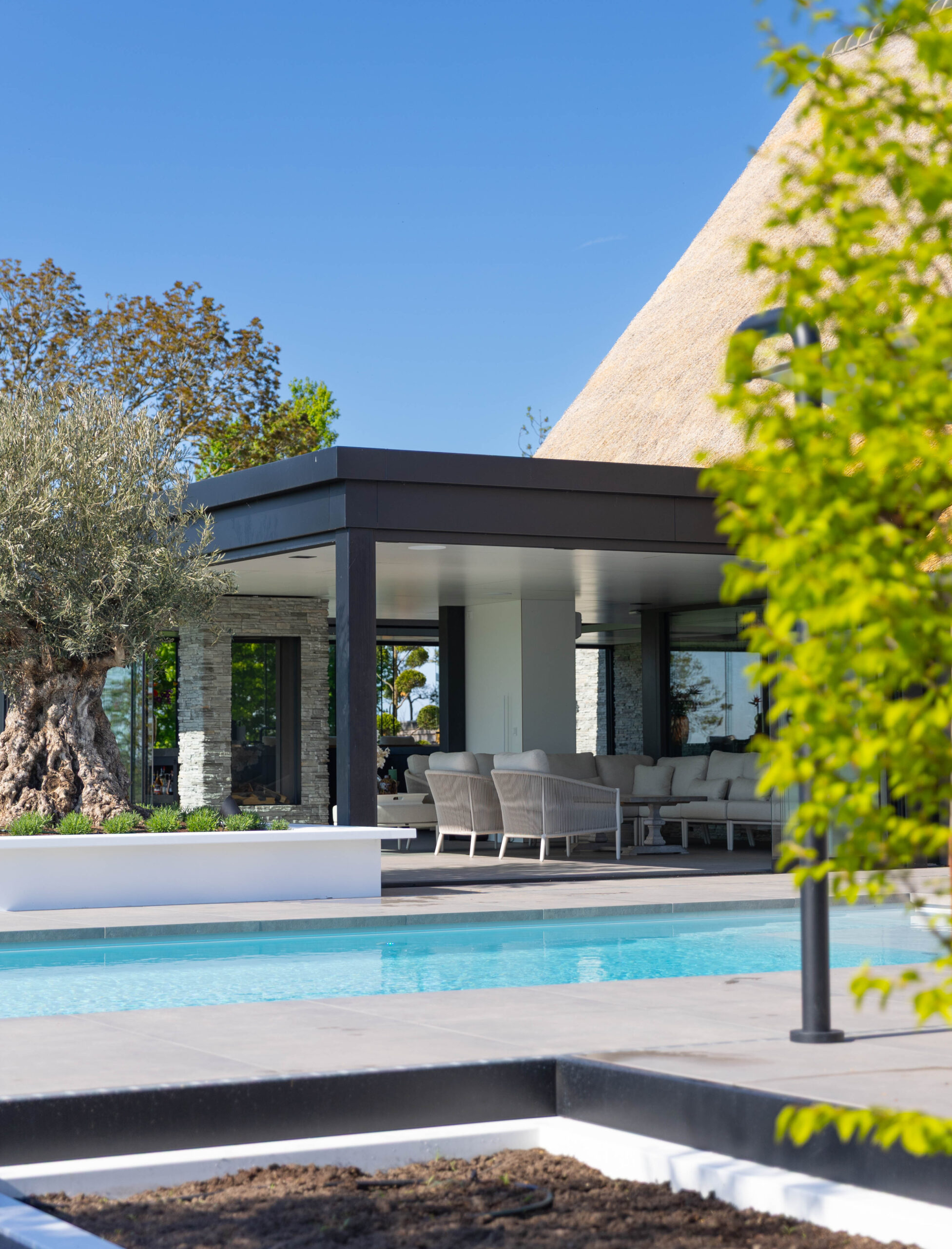• Karakteristieke olijfbomen: De eeuwenoude olijfbomen stelen de show. Door ze in verhoogde, strak gestucte witte plantenbakken te plaatsen, komen ze prachtig tot hun recht en is de afwatering perfect geregeld.
