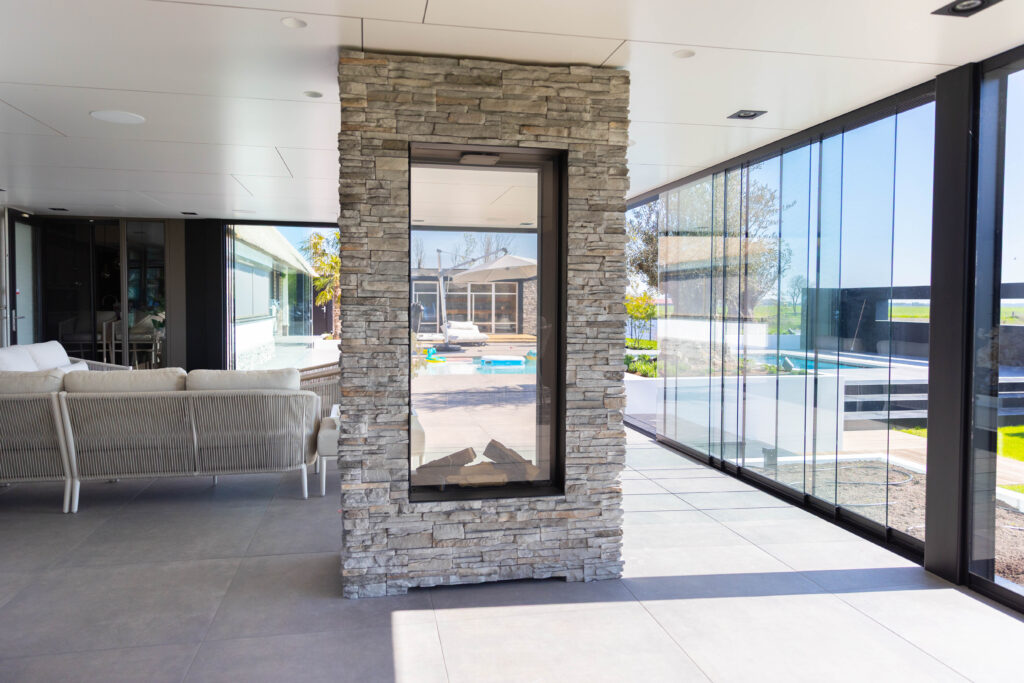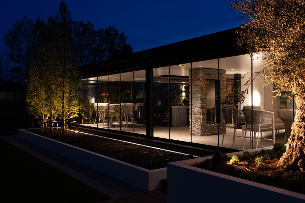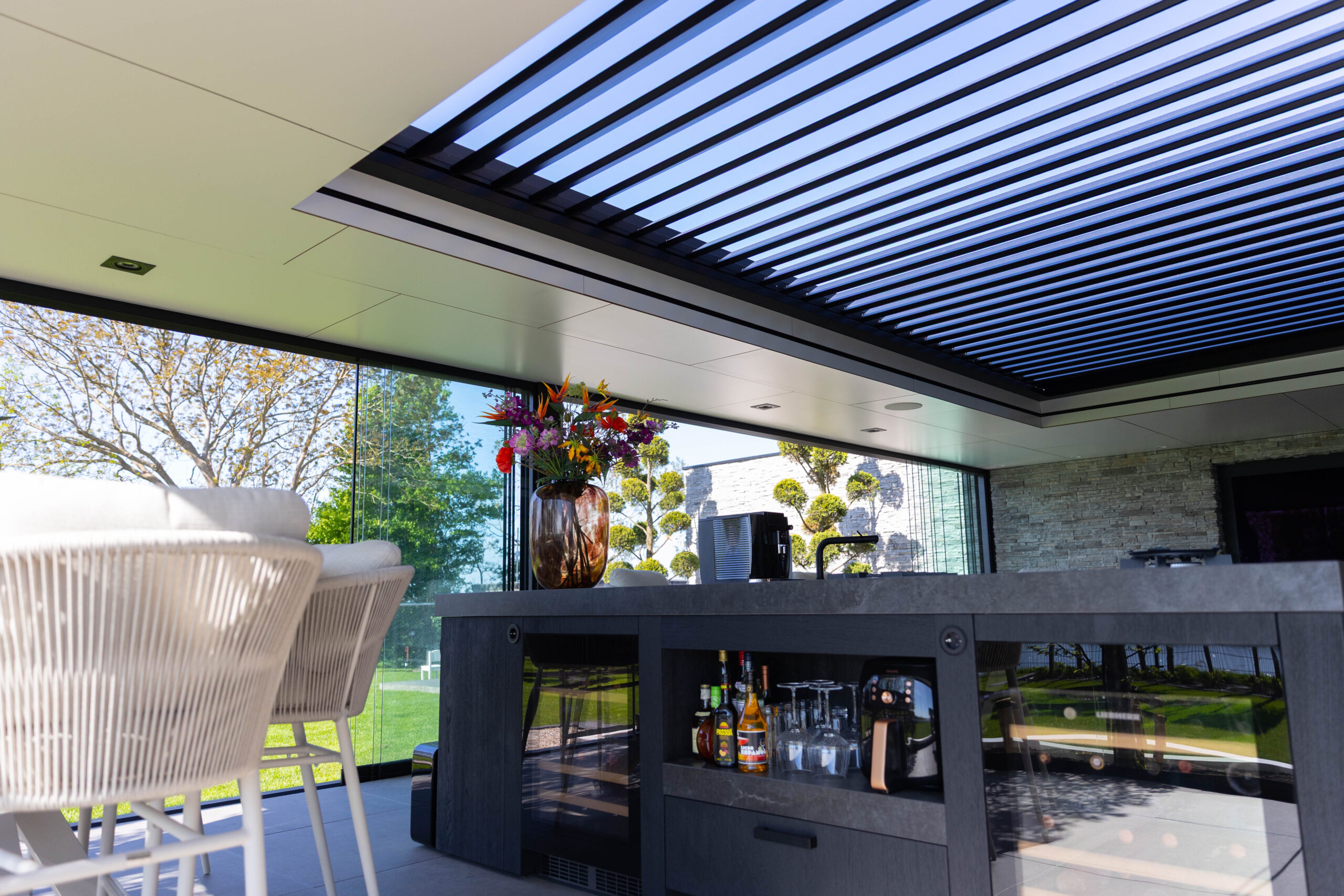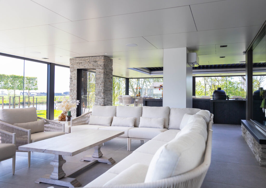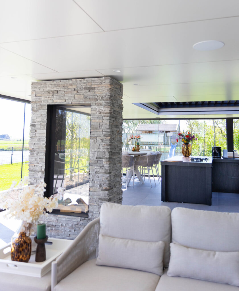 Het hart van deze tuin is het royale, op maat gemaakte buitensalon. Dit is geen standaard buitenhuis, maar een volwaardige leefruimte. Dankzij de naadloze glazen schuifwanden en het elektrische lamellendak is het hier in elk seizoen heerlijk vertoeven. De ruimte is opgedeeld door een indrukwekkende haard met natuursteen.
