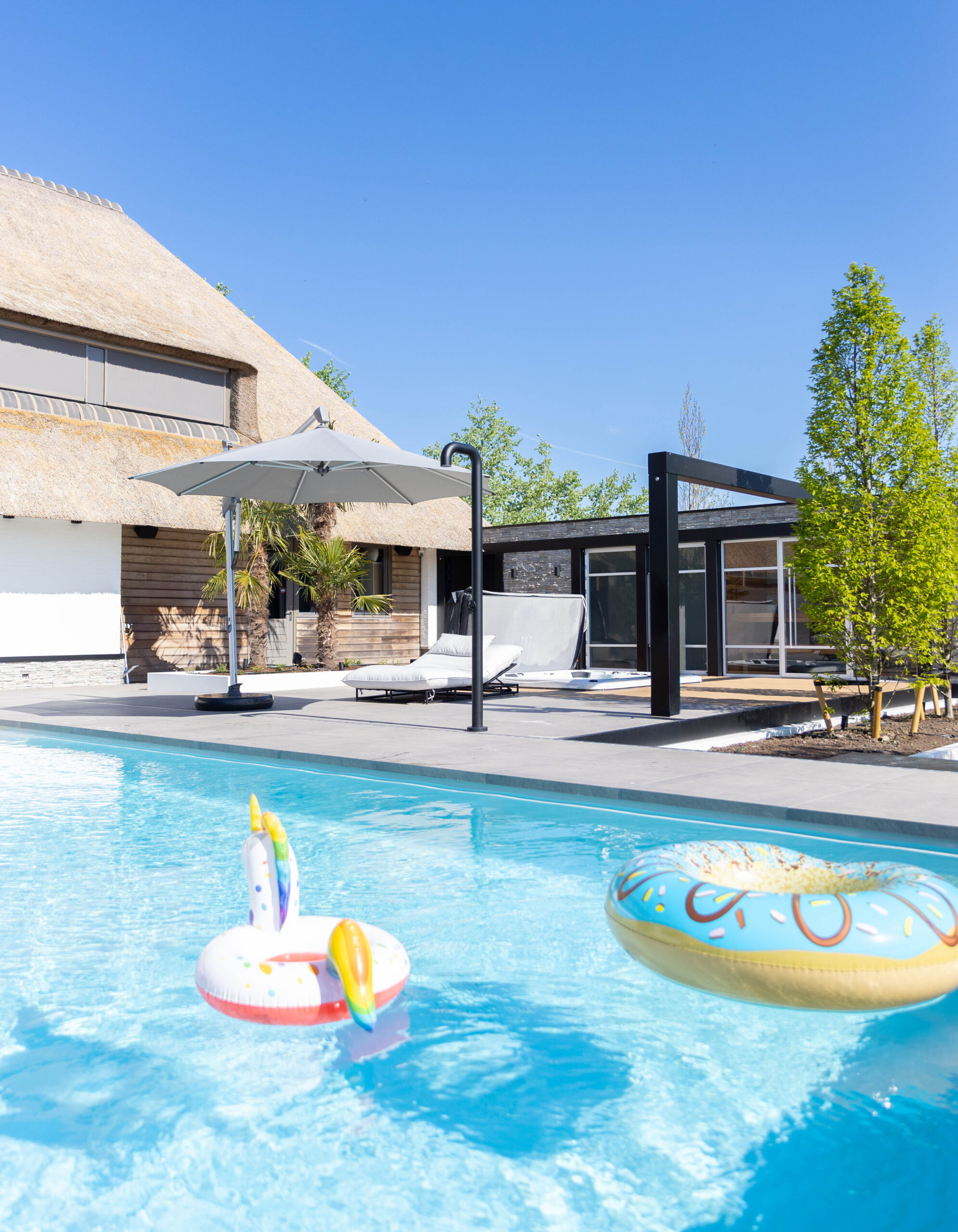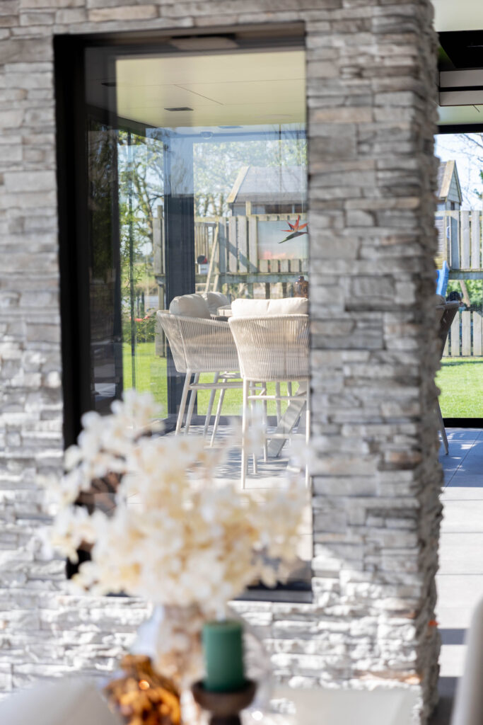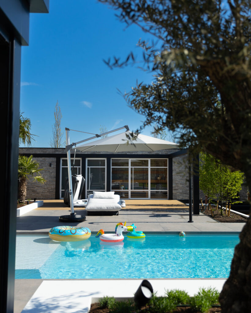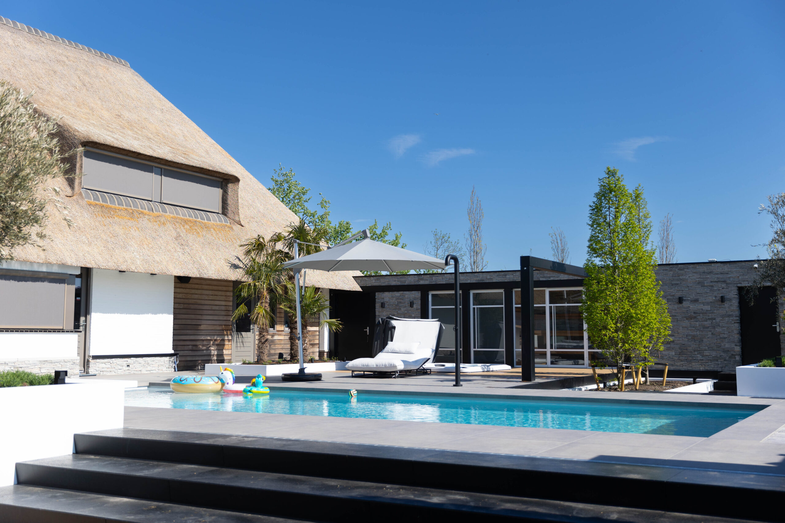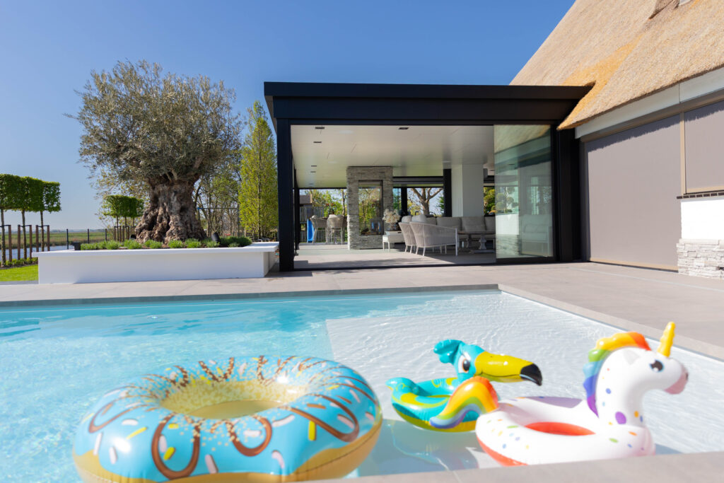 Buiten de tuinkamer gaat het genieten verder. We hebben een strak, helderblauw zwembad aangelegd dat mooi overloopt in het omliggende terras van grote, keramische tegels. Voor de koudere dagen is er een luxe, op maat gemaakte buitensauna gerealiseerd. De combinatie van warm hout en robuuste natuursteenstrips geeft deze sauna een exclusieve uitstraling.