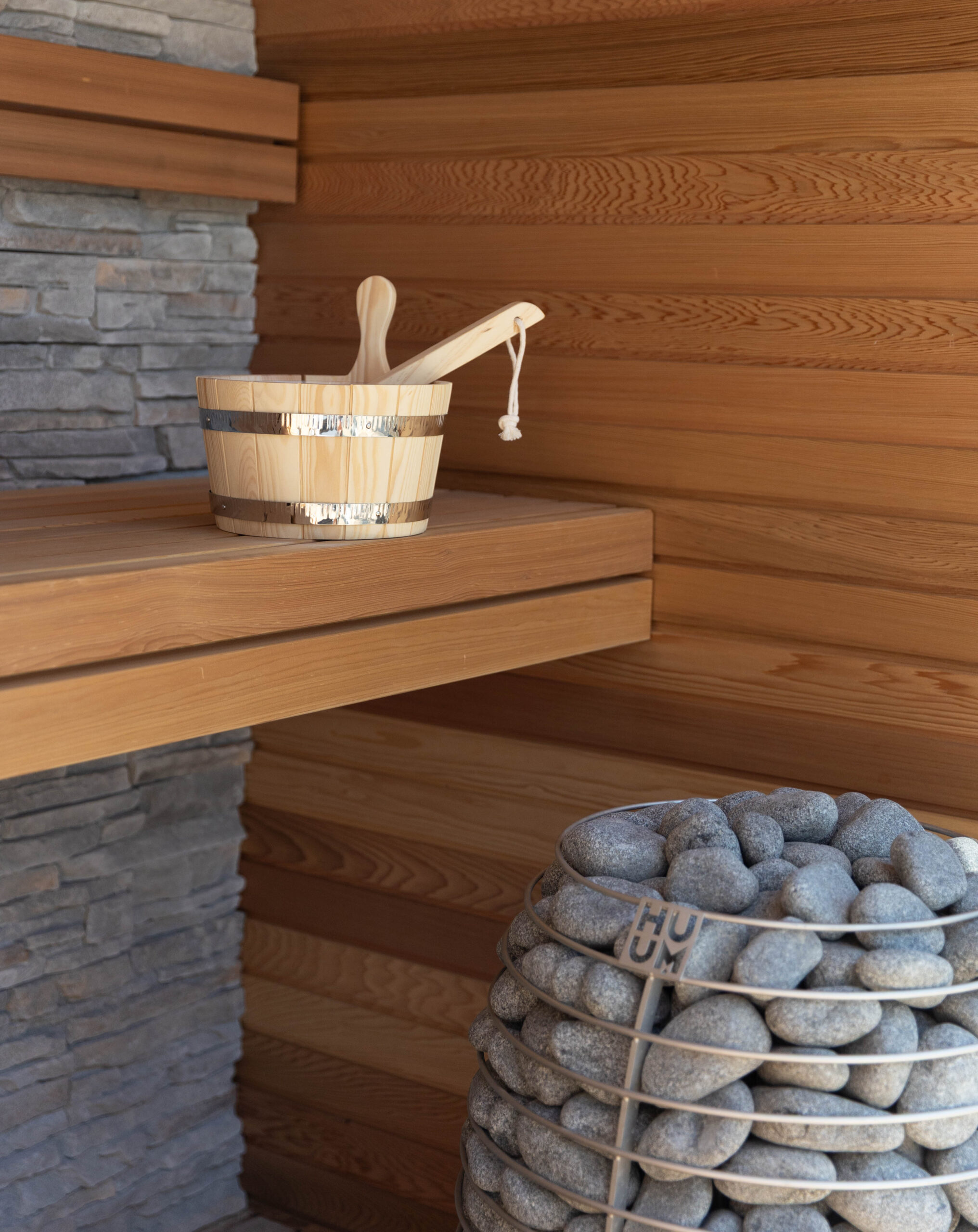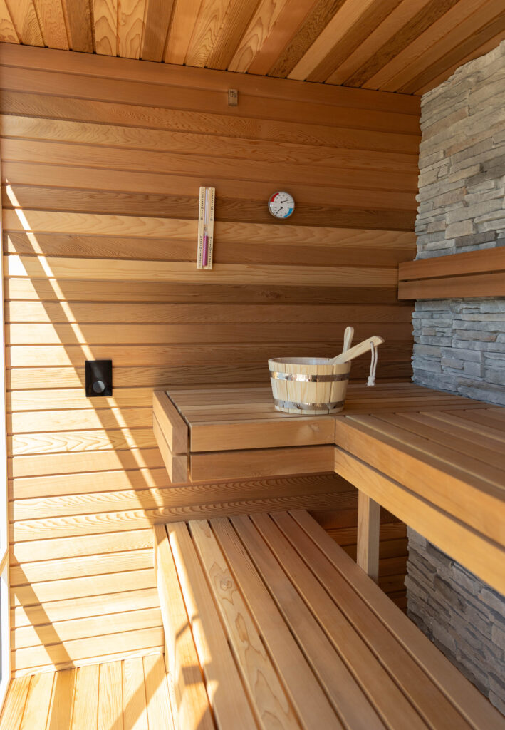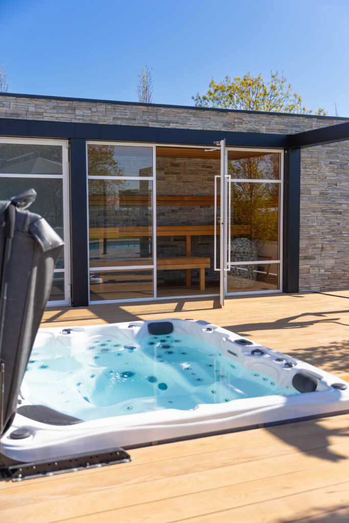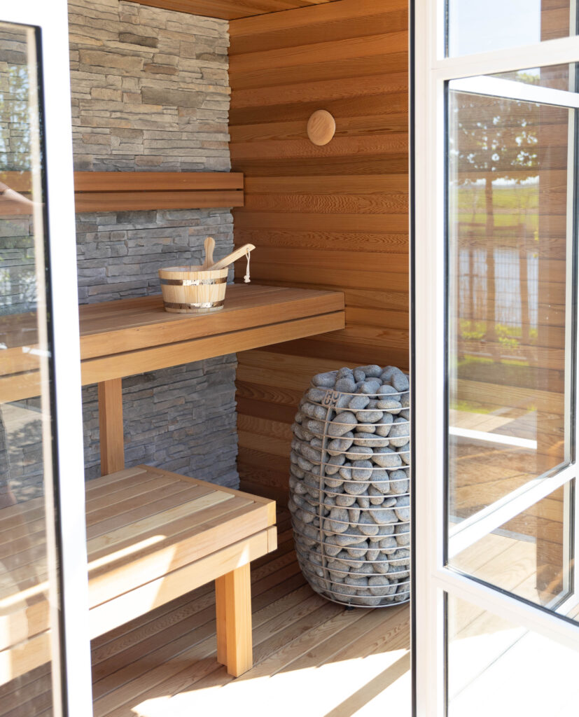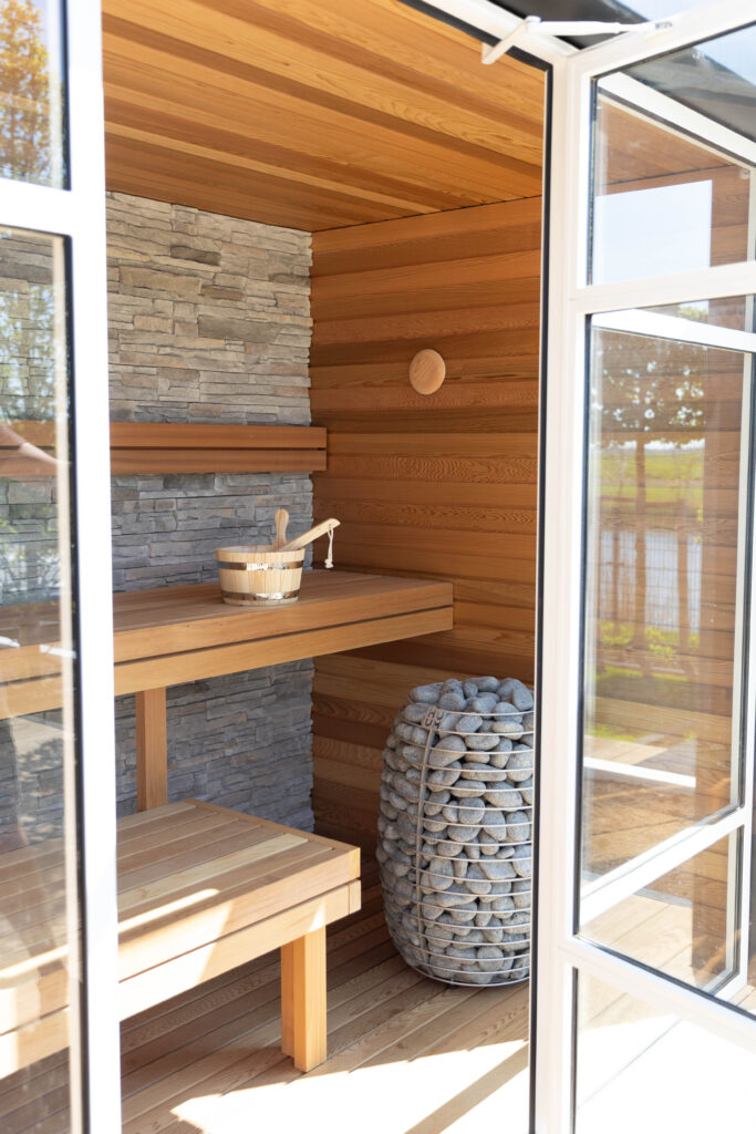 Buiten de tuinkamer gaat het genieten verder. We hebben een strak, helderblauw zwembad aangelegd dat mooi overloopt in het omliggende terras van grote, keramische tegels. Voor de koudere dagen is er een luxe, op maat gemaakte buitensauna gerealiseerd. De combinatie van warm hout en robuuste natuursteenstrips geeft deze sauna een exclusieve uitstraling.