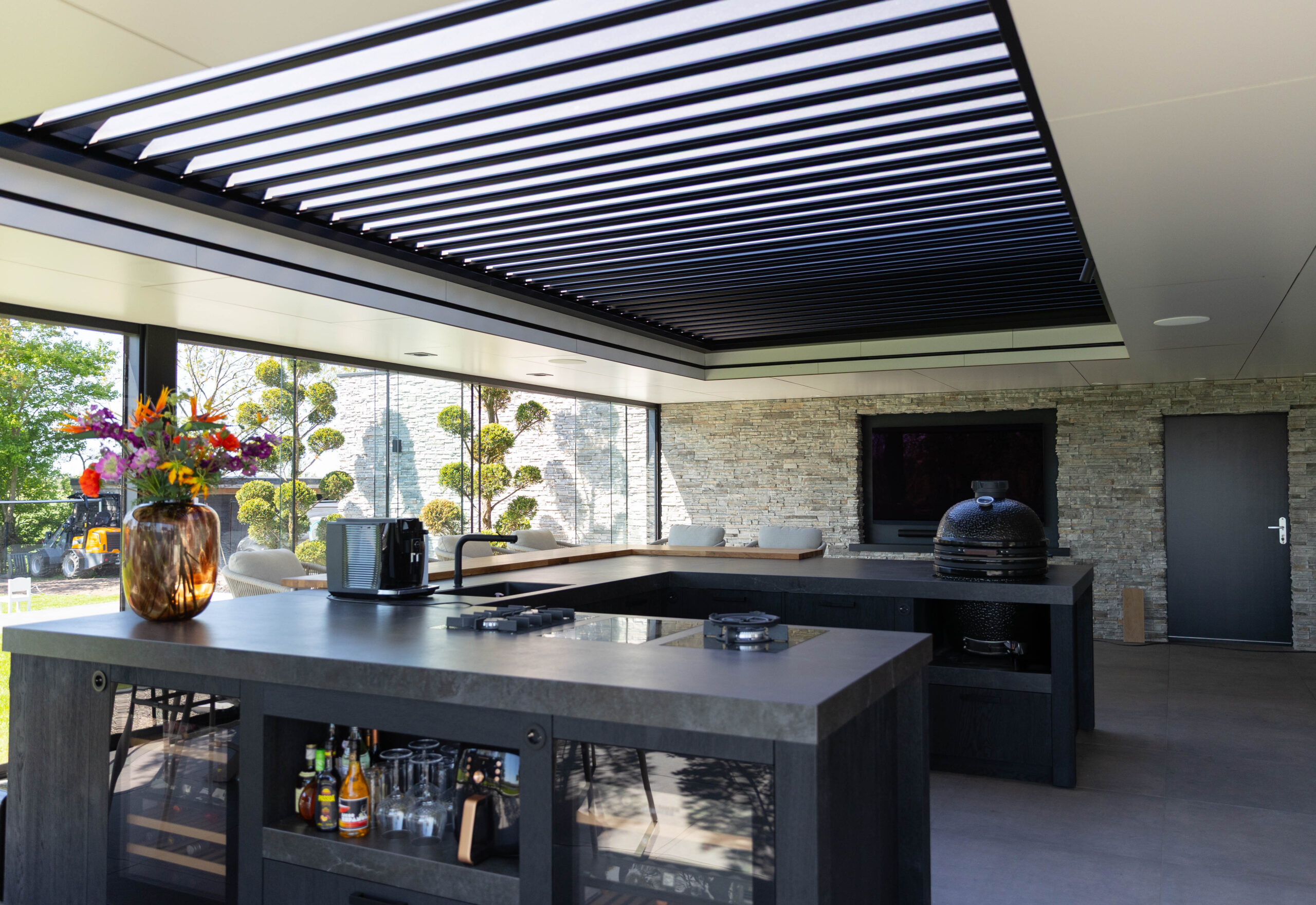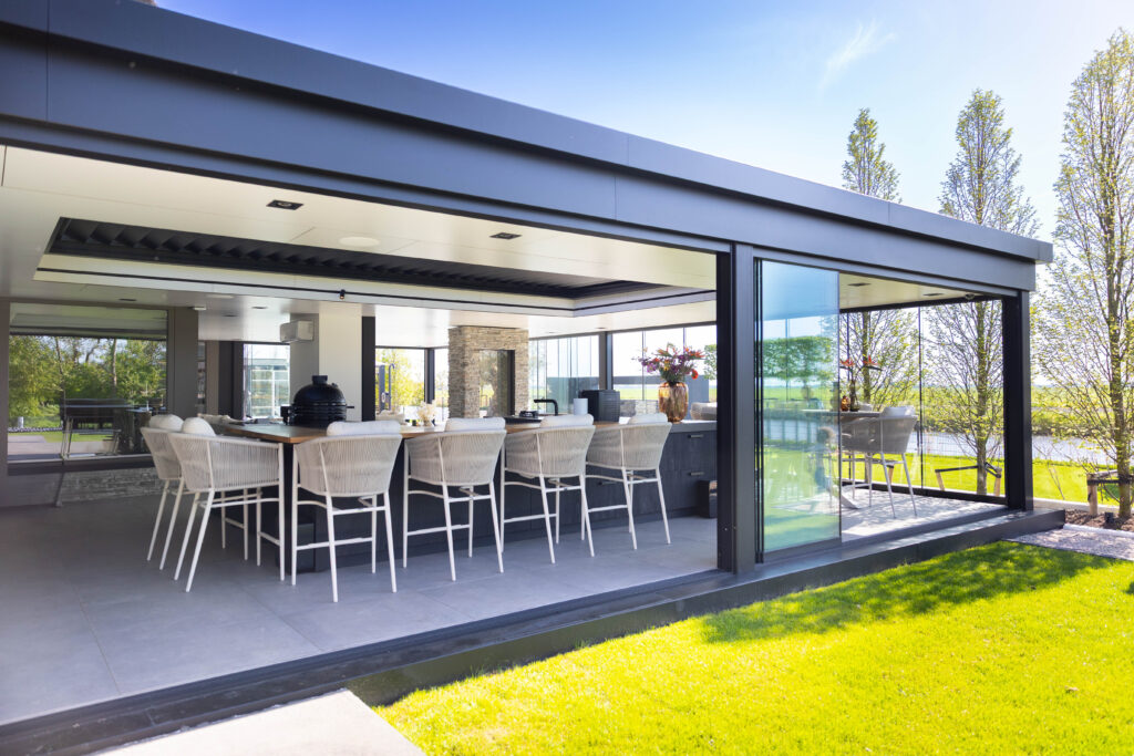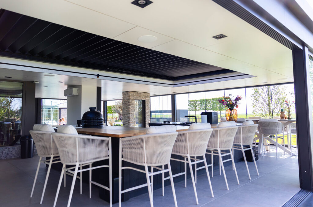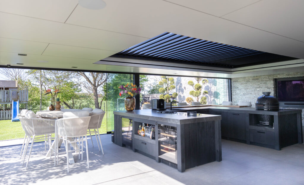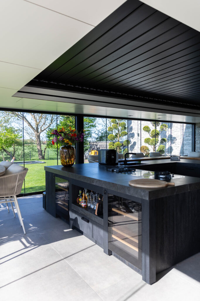 Aan de ene kant vind je een gezellige loungehoek, aan de andere kant een droom van een buitenkeuken. Compleet met een kookeiland, wijnklimaatkast en een ingebouwde kamado-barbecue.