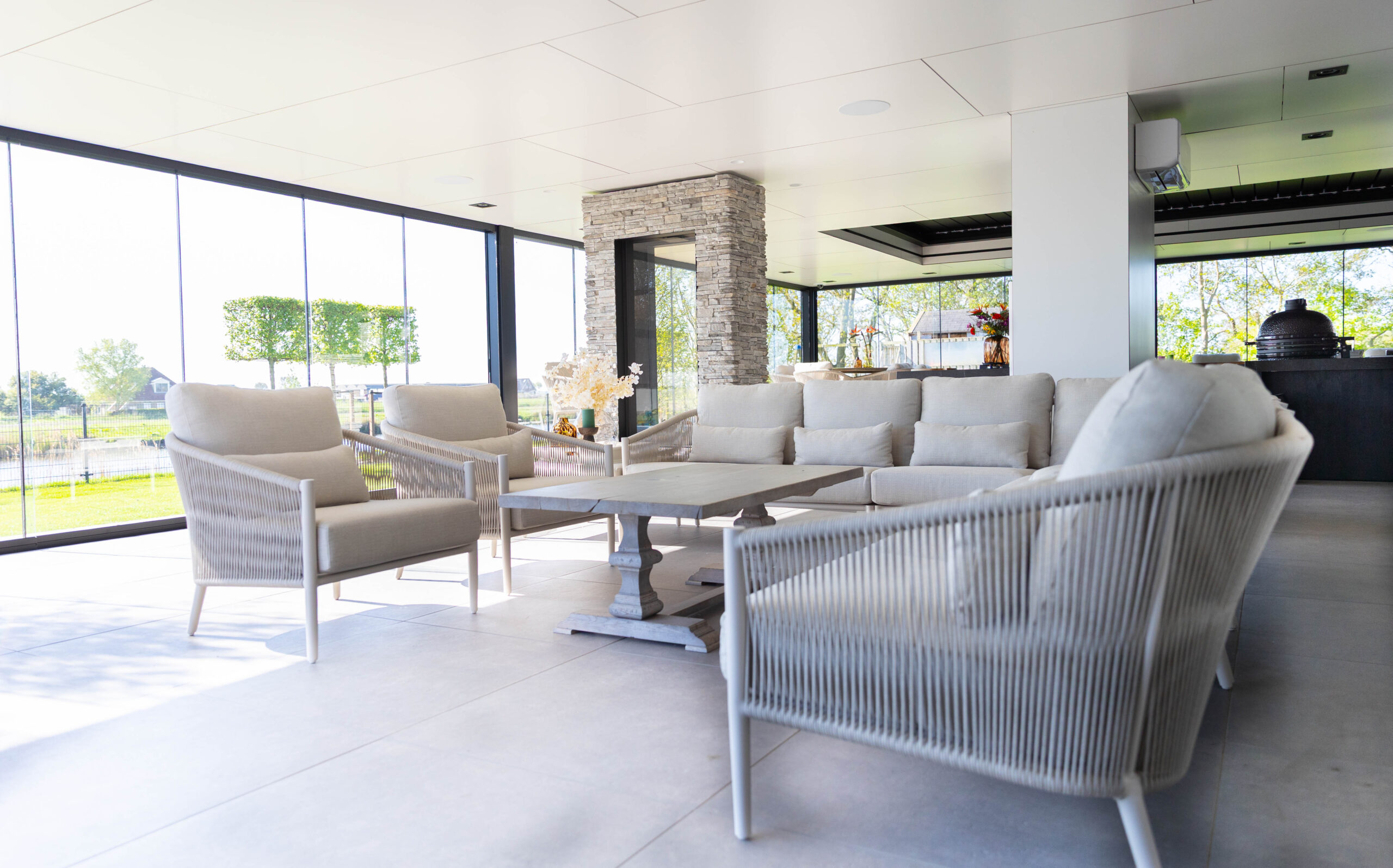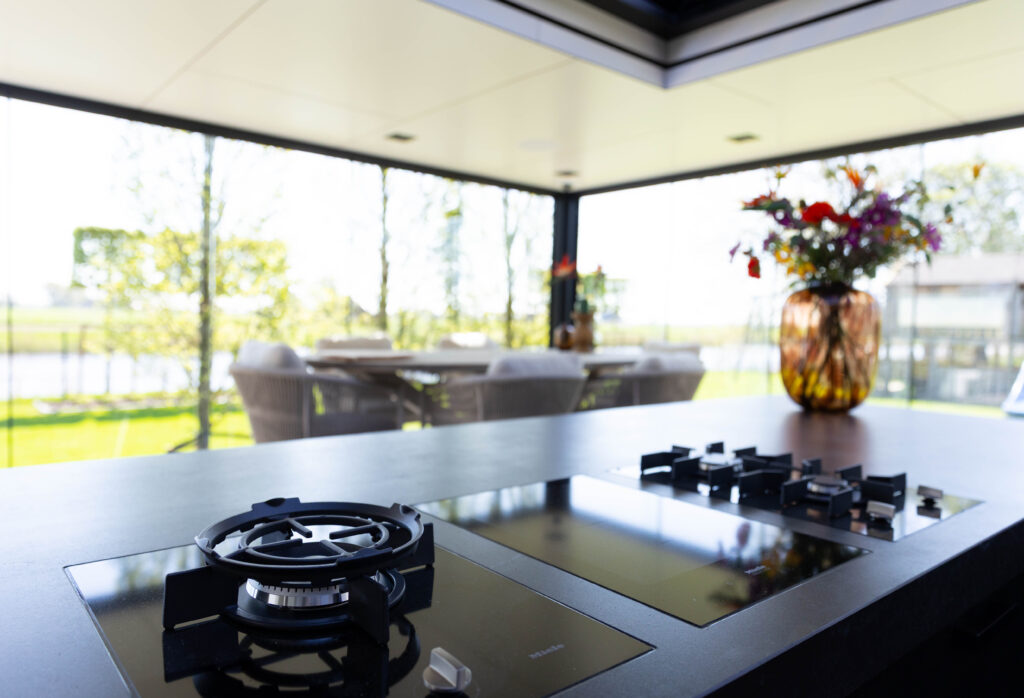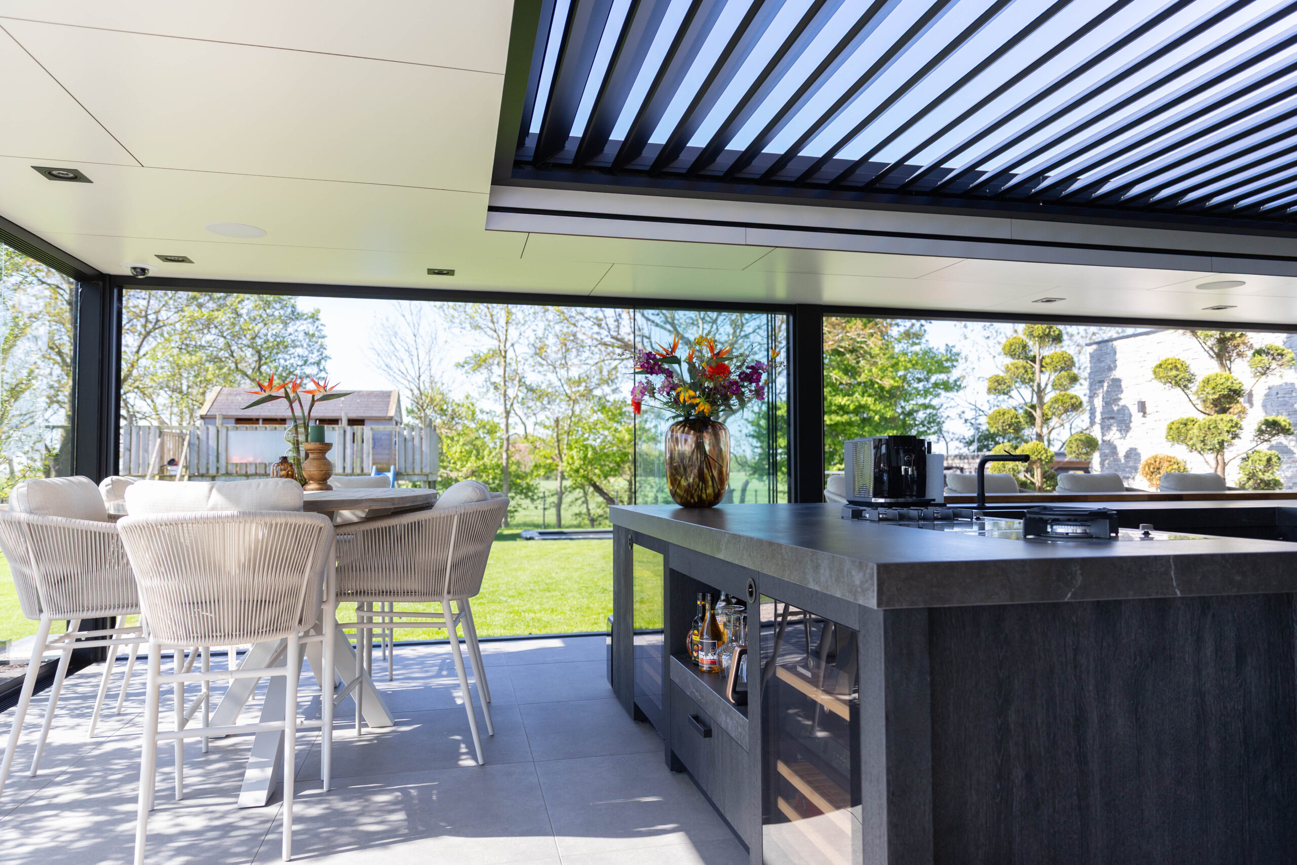 Aan de ene kant vind je een gezellige loungehoek, aan de andere kant een droom van een buitenkeuken. Compleet met een kookeiland, wijnklimaatkast en een ingebouwde kamado-barbecue.