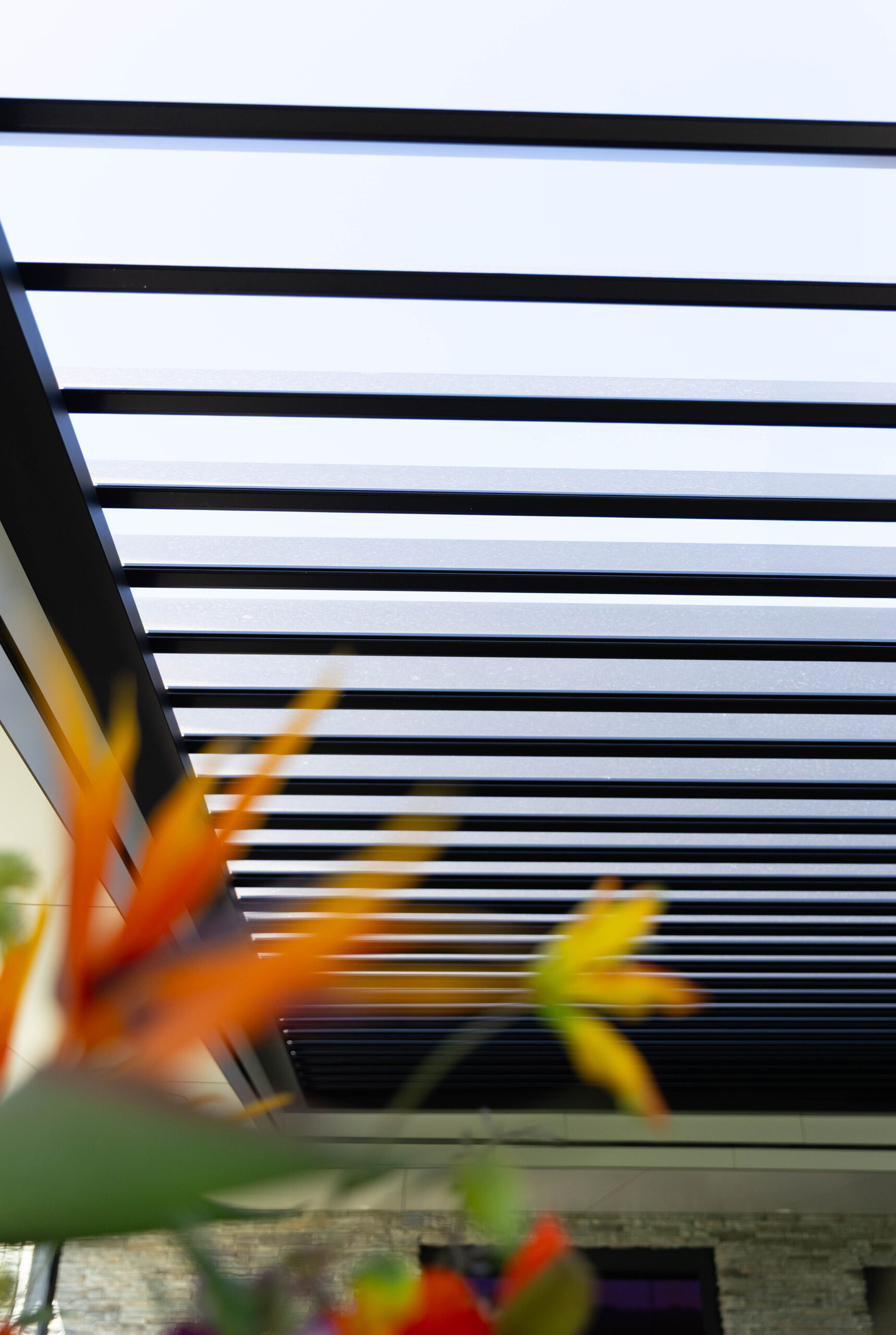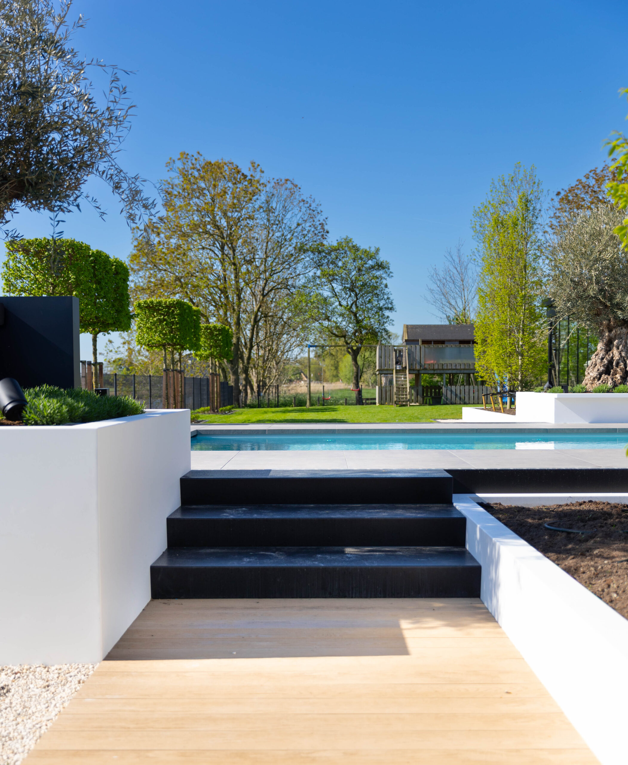 • Strakke lijnen: De witte plantenbakken vormen een sterk contrast met de zwarte, ‘zwevende’ traptreden en de warme houten vlonderpaden.
