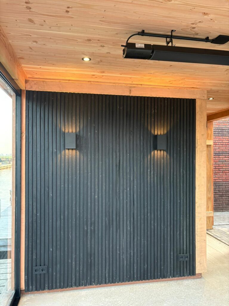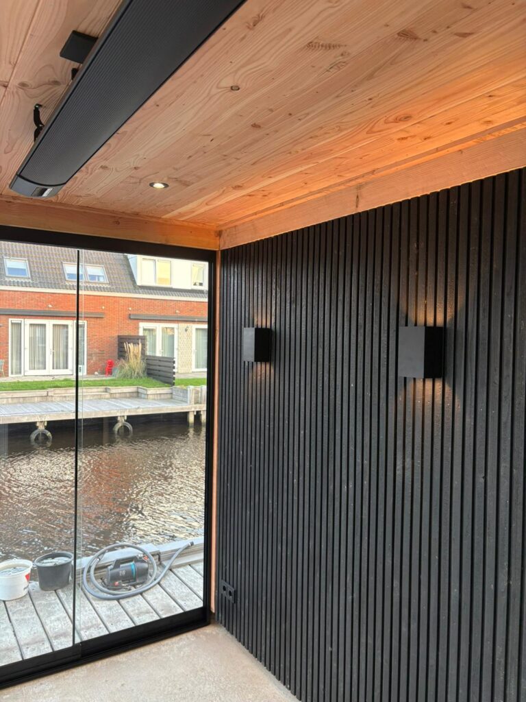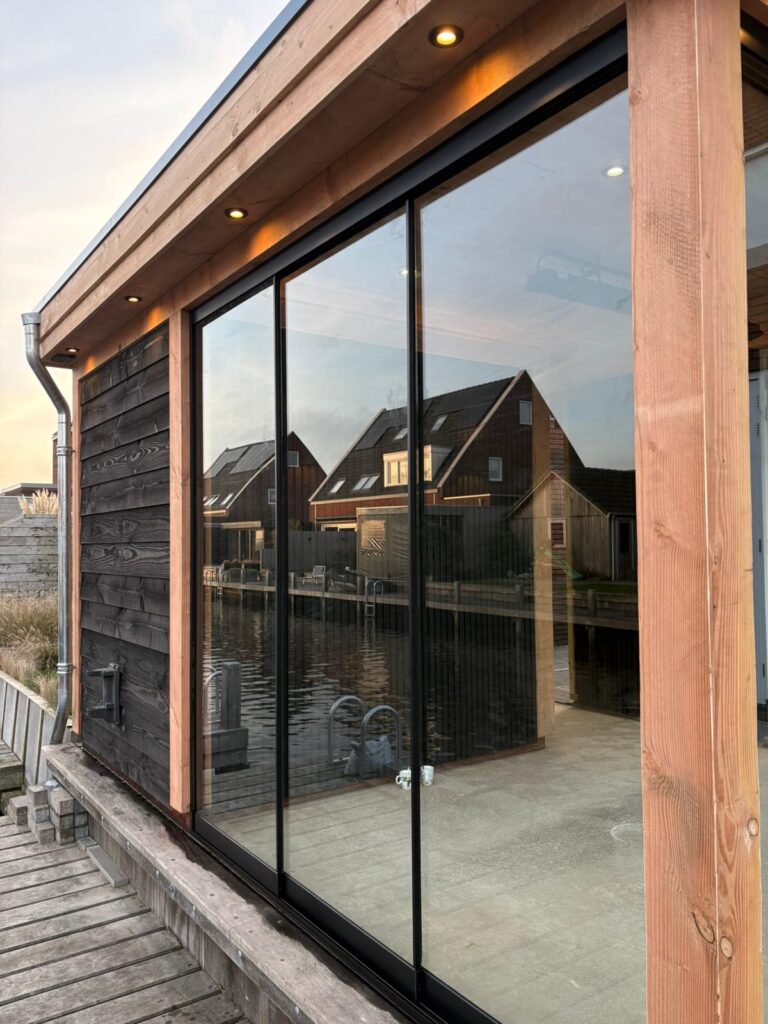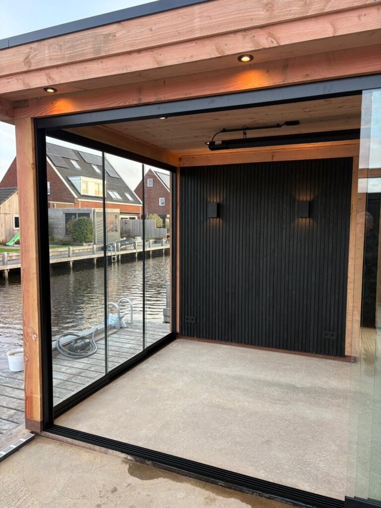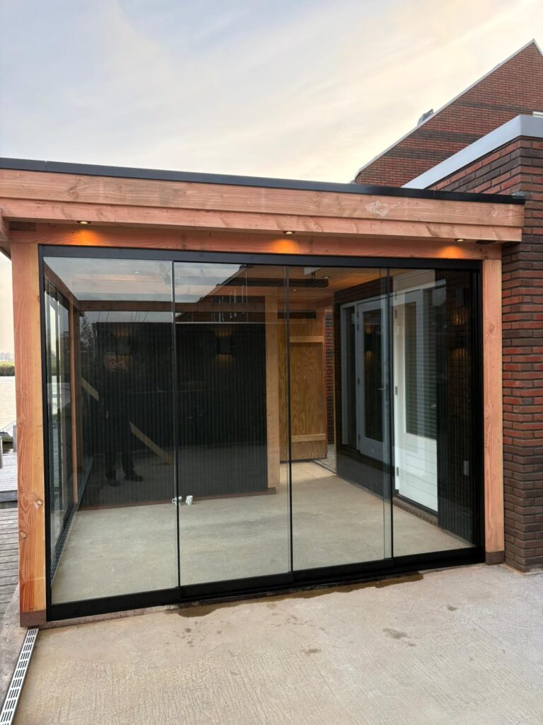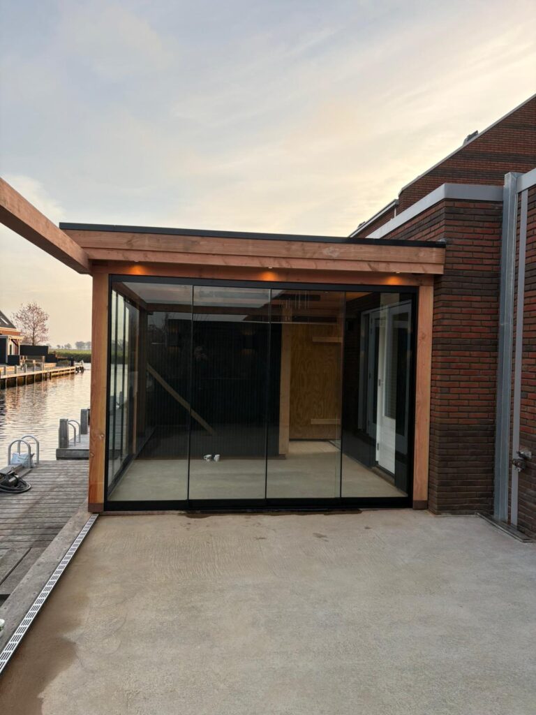 Maatwerk en transparantie Het hart van deze buitenruimte is de ruime tuinkamer, gebouwd van hoogwaardig hout met een warme, natuurlijke uitstraling. Dankzij de naadloze glazen schuifwanden is de kamer in elk seizoen te gebruiken. In de zomer gaan de wanden open voor een directe verbinding met de tuin, in de koelere maanden bieden ze beschutting zonder het zicht op het groen te verliezen. Direct aangrenzend bevindt zich een praktische en strakke berging, perfect voor het opbergen van tuingereedschap en kussens.