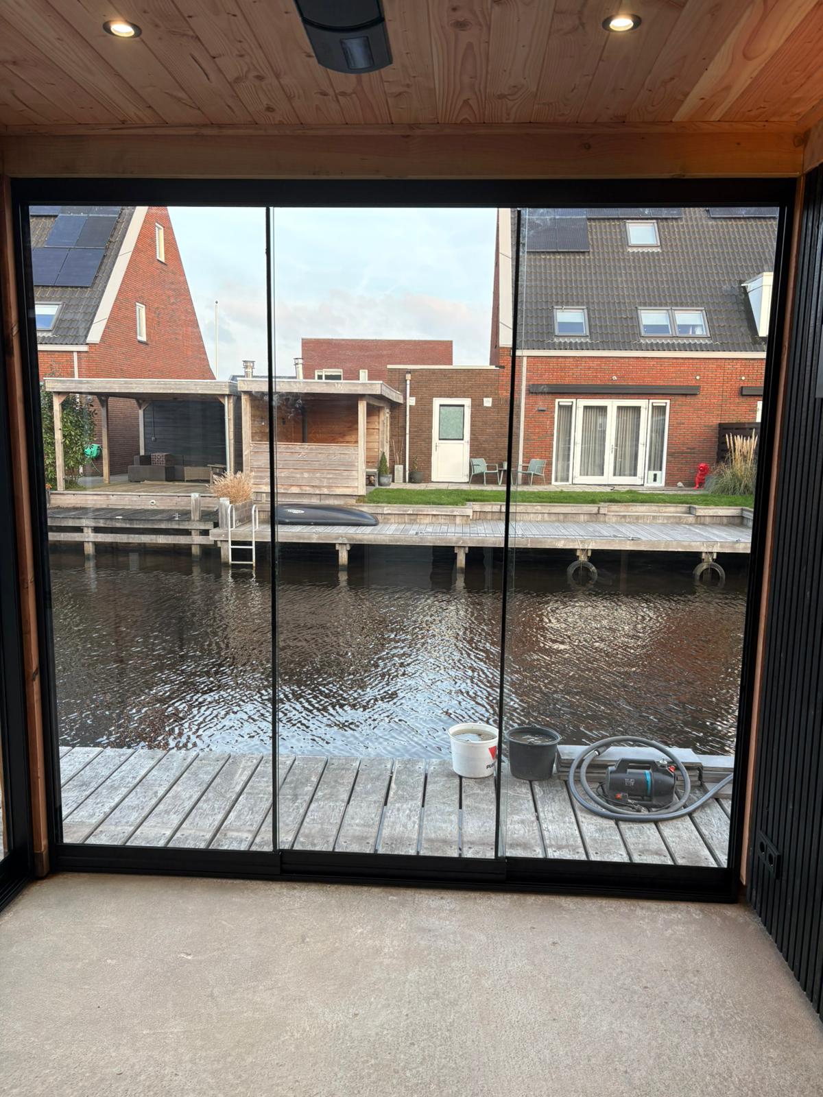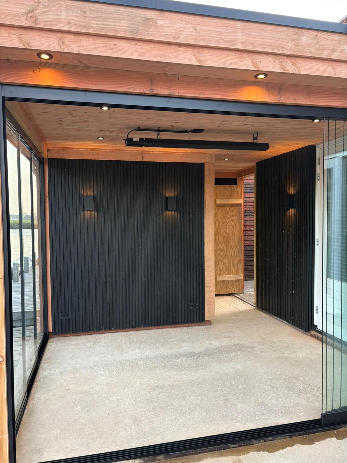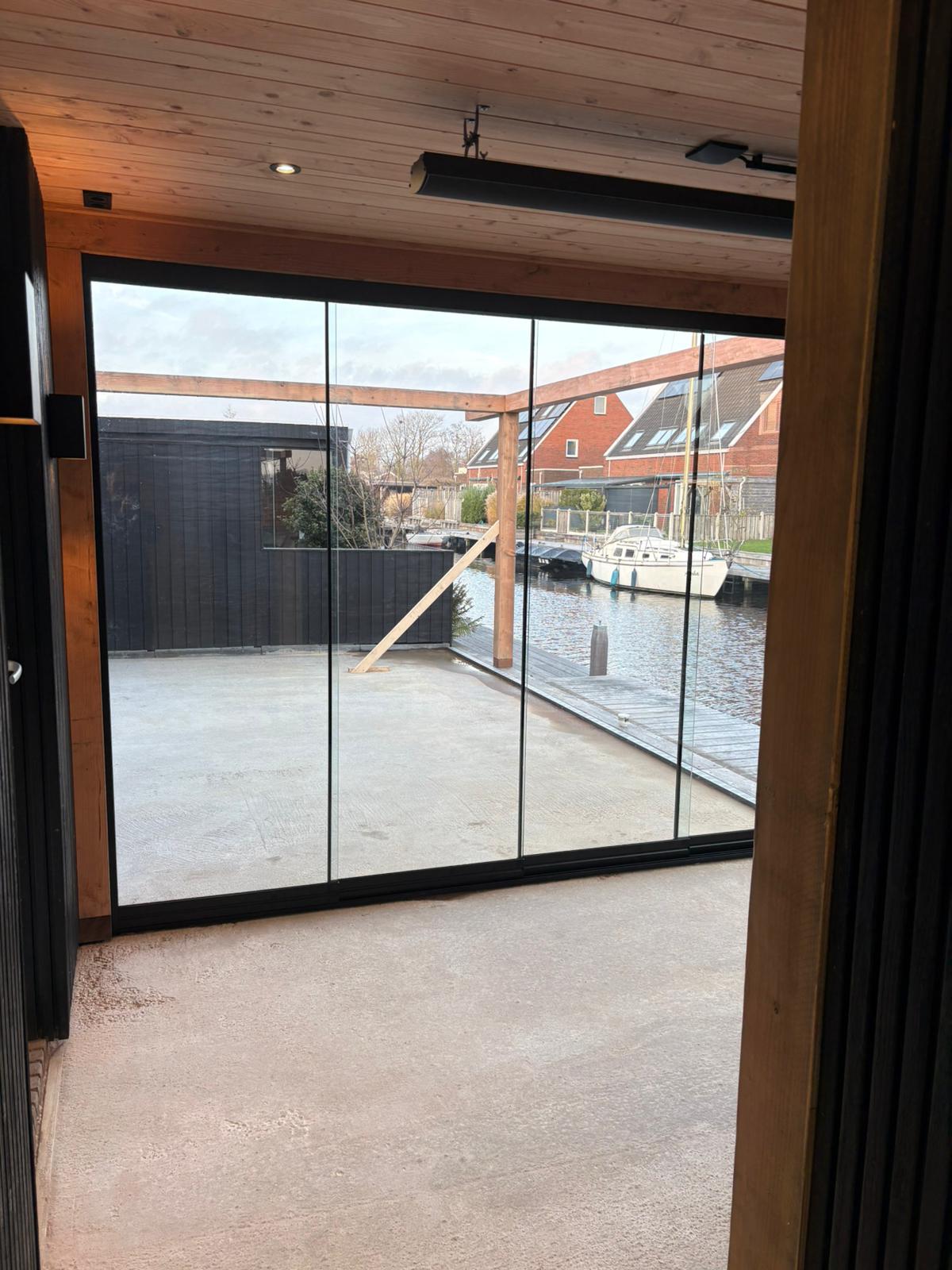 Maatwerk en transparantie Het hart van deze buitenruimte is de ruime tuinkamer, gebouwd van hoogwaardig hout met een warme, natuurlijke uitstraling. Dankzij de naadloze glazen schuifwanden is de kamer in elk seizoen te gebruiken. In de zomer gaan de wanden open voor een directe verbinding met de tuin, in de koelere maanden bieden ze beschutting zonder het zicht op het groen te verliezen. Direct aangrenzend bevindt zich een praktische en strakke berging, perfect voor het opbergen van tuingereedschap en kussens.