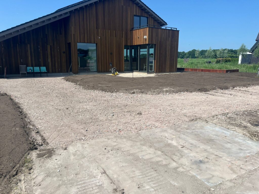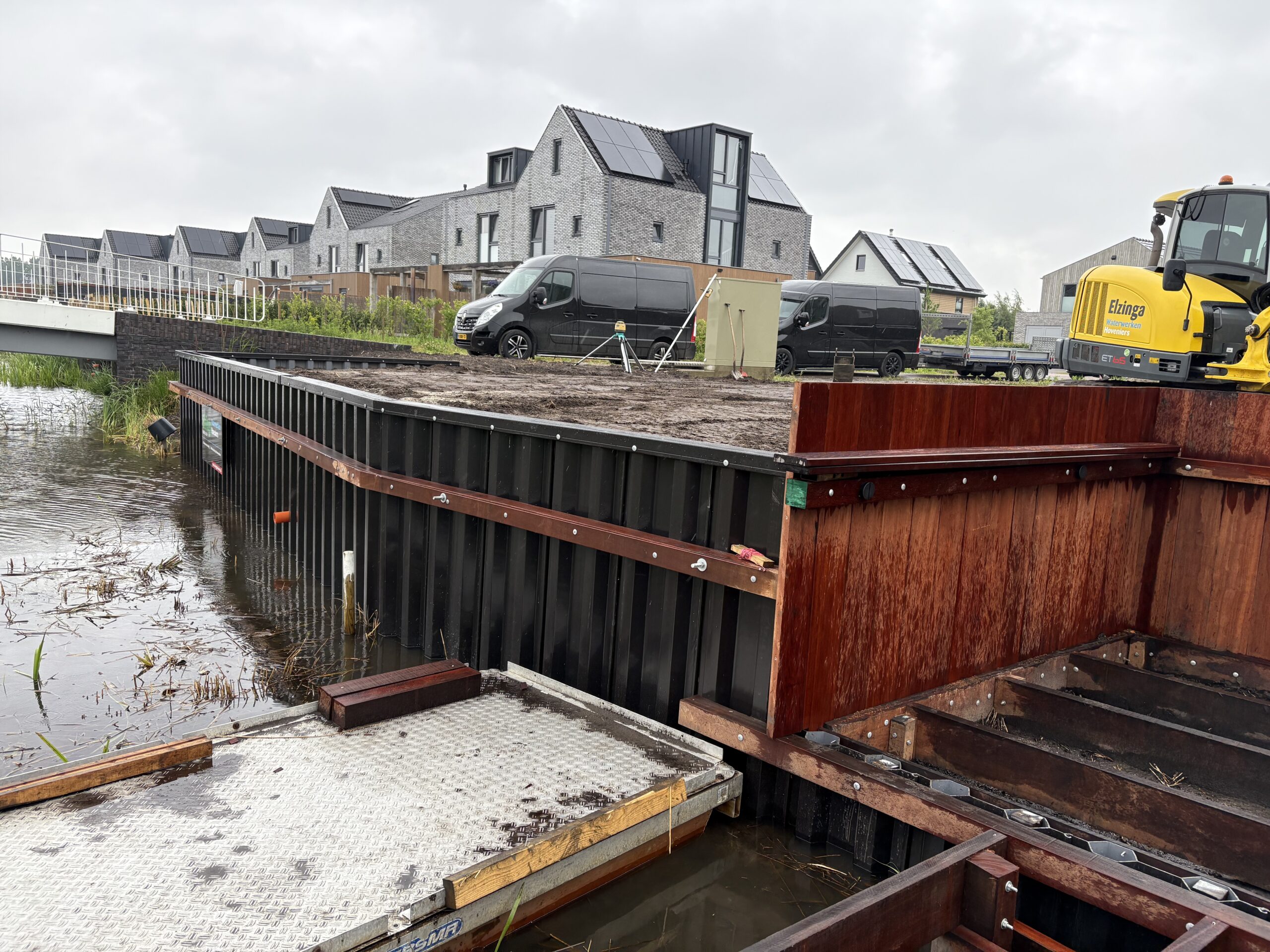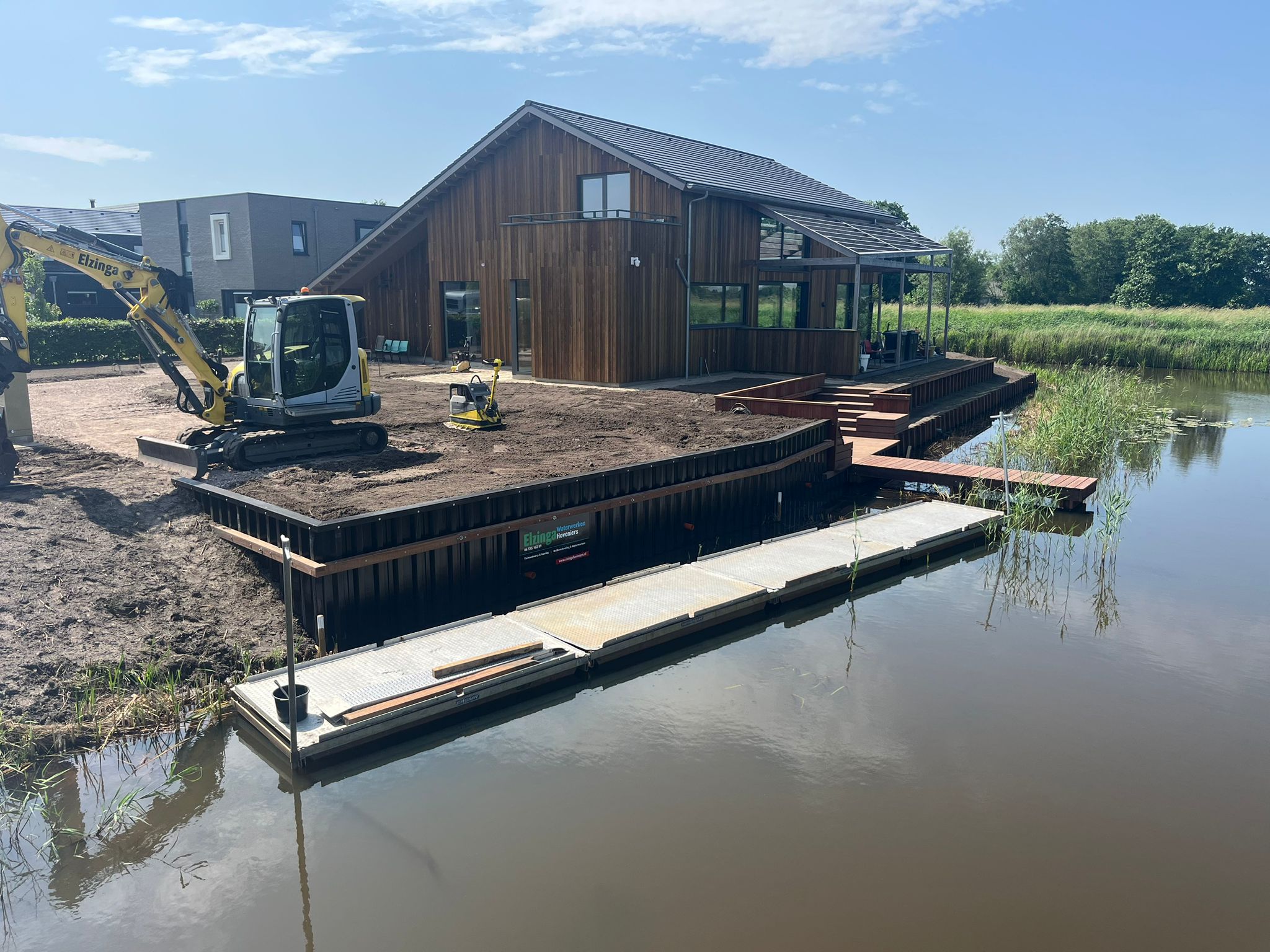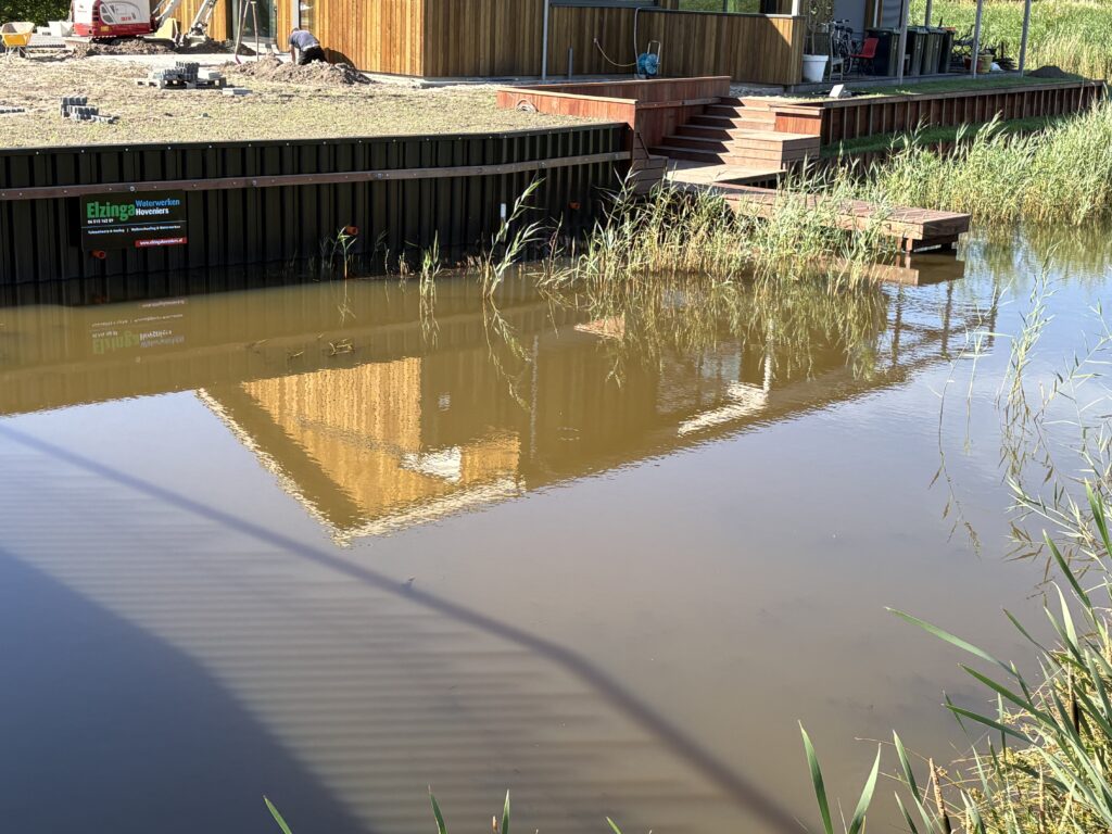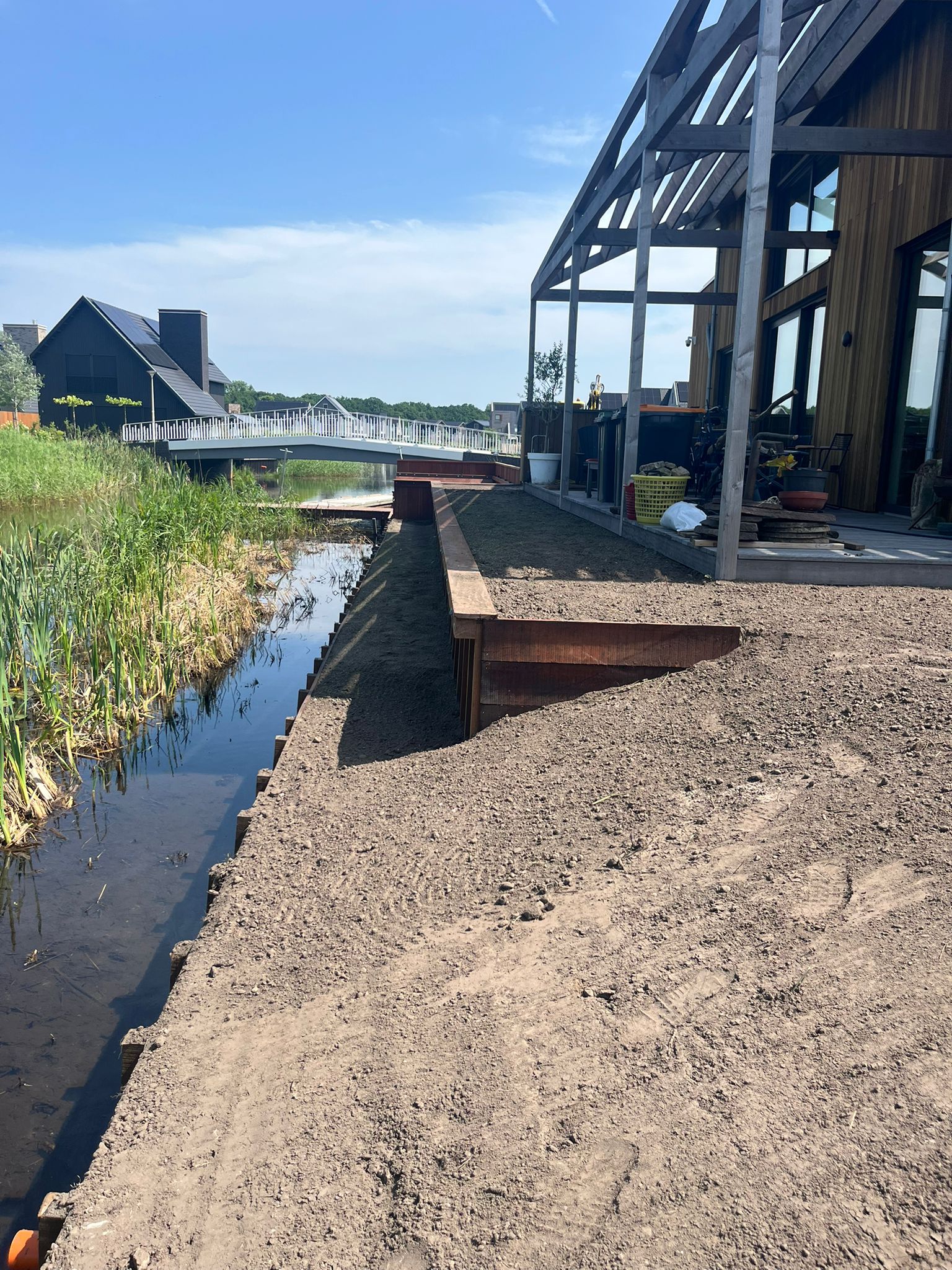 Strak grondwerk Na het plaatsen van de beschoeiing hebben we de grond achter de kering aangevuld en strakgetrokken. Hiermee is de oeverzone definitief gezekerd en ontstaat er een strakke, bruikbare lijn langs het water. Met dit project in Eelderwolde hebben we een duurzame en functionele basis gecreëerd.
