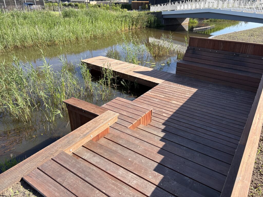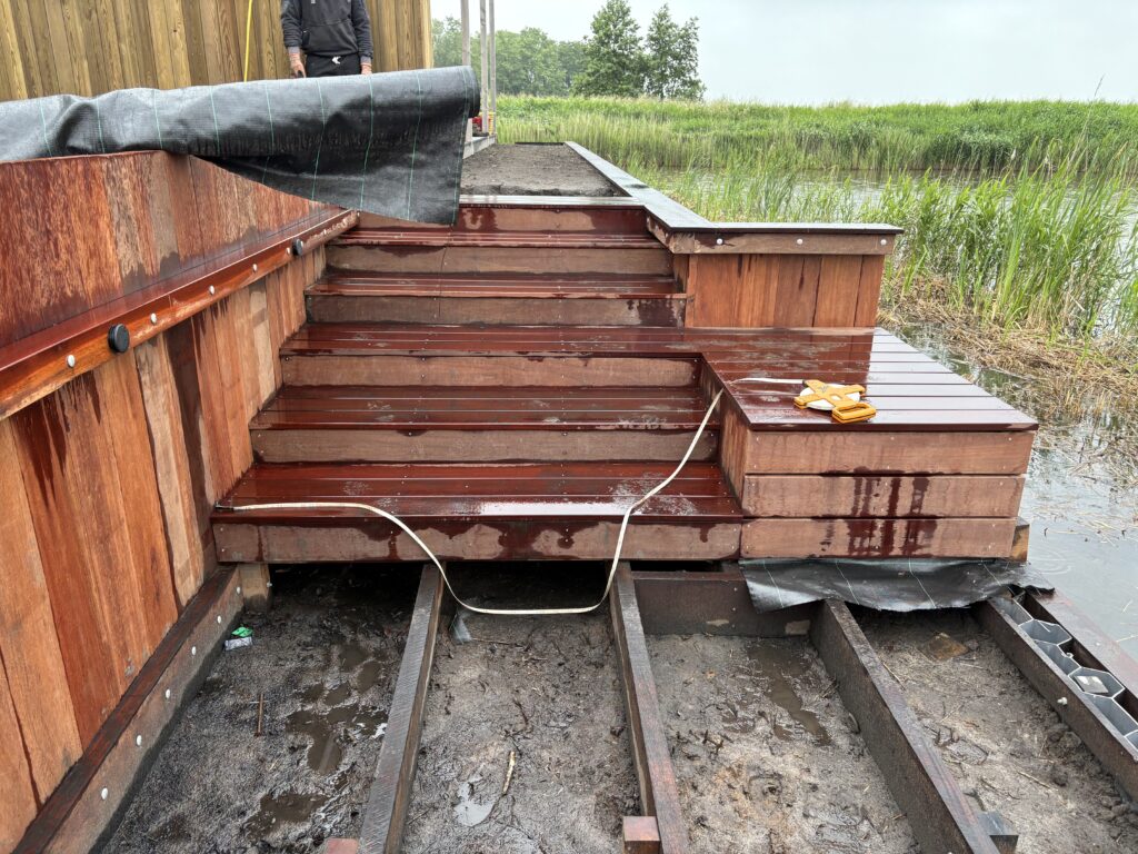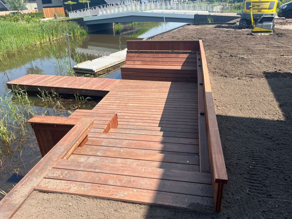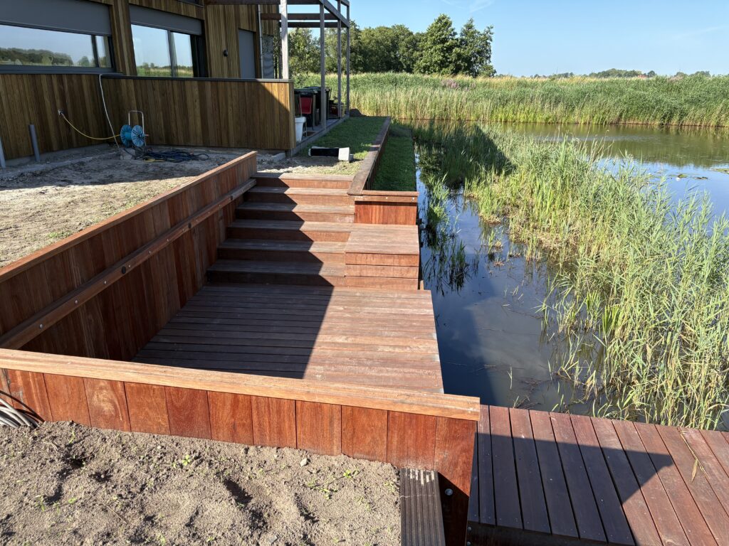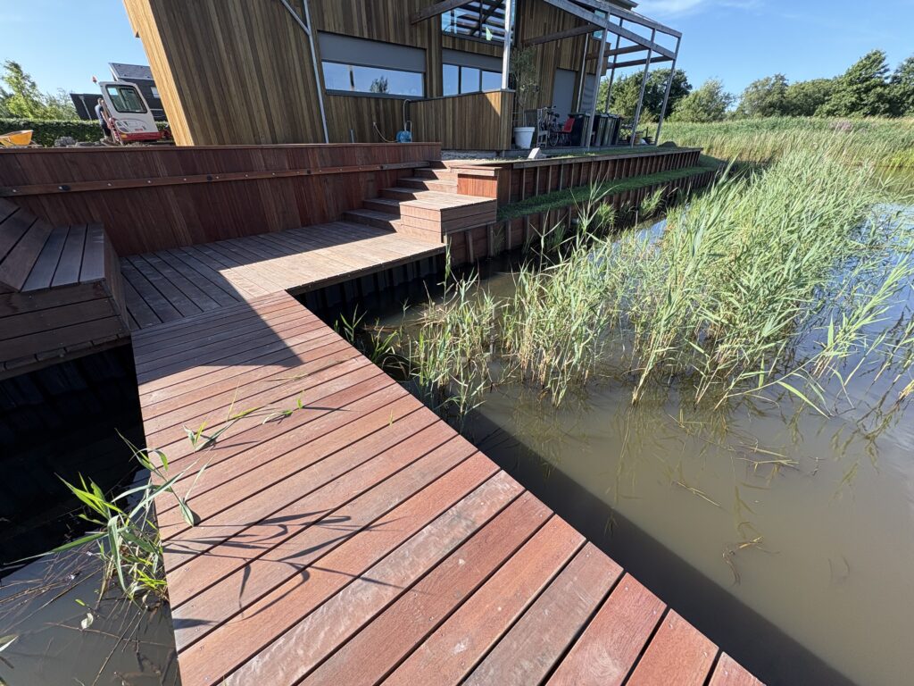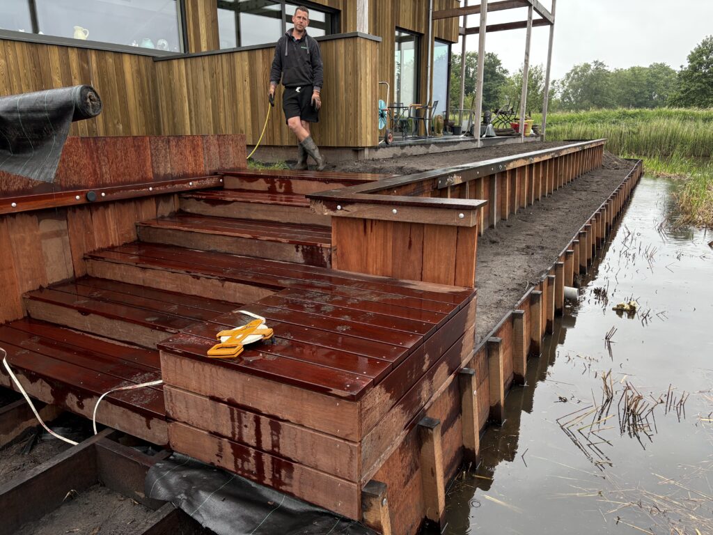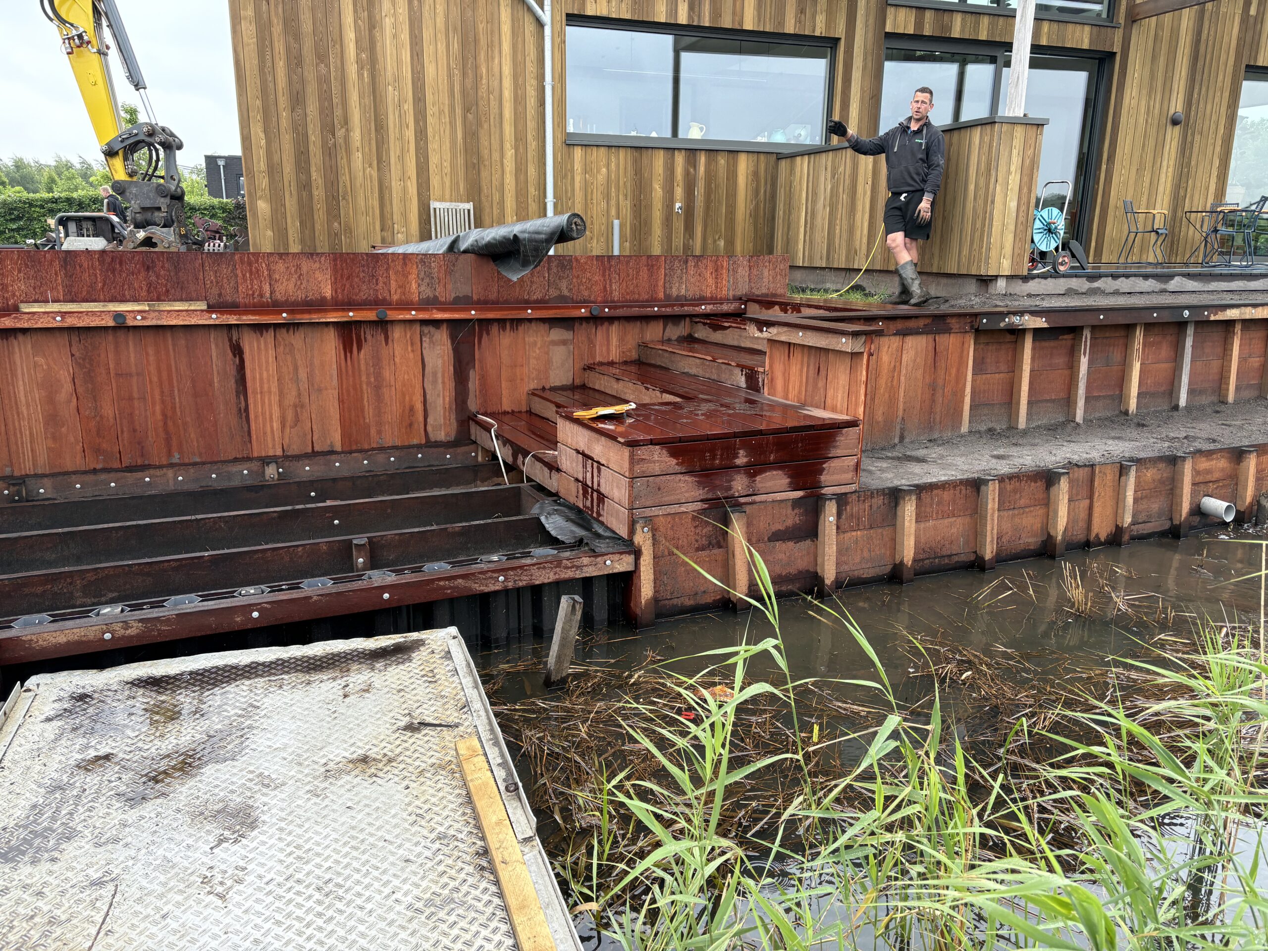Solide constructie We hebben gekozen voor een robuuste walbeschoeiing van hoogwaardig hardhout. De constructie bestaat uit zware palen die diep in de grond zijn geslagen, met daarachter stevige schotten. Om de stabiliteit te garanderen en de druk van het achterliggende talud op te vangen, is de beschoeiing met ankers in de grond verankerd.